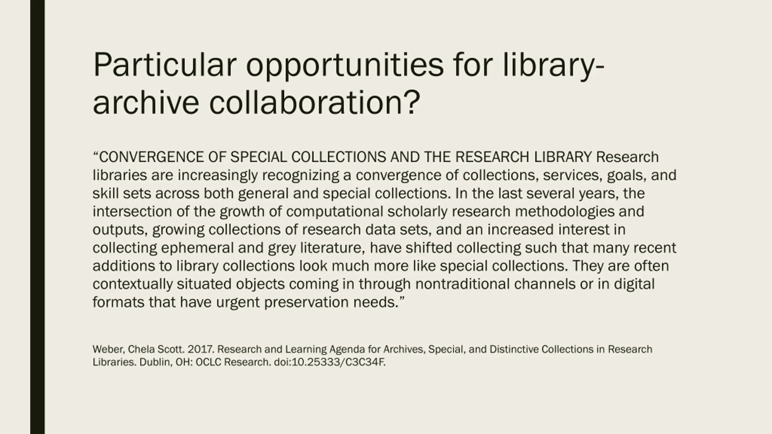 Particular opportunities for library- archive collaboration? CONVERGENCE OF SPECIAL COLLECTIONS AND THE RESEARCH LIBRARY Research libraries are increasingly recognizing a convergence of collections, services, goals, and skill sets across both general and special collections. In the last several years, the intersection of the growth of computational scholarly research methodologies and outputs, growing collections of research data sets, and an increased interest in collecting ephemeral and grey literature, have shifted collecting such that many recent additions to library collections look much more like special collections. They are often contextually situated objects coming in through nontraditional channels or in digital formats that have urgent preservation needs. Weber, Chela Scott. 2017. Research and Learning Agenda for Archives, Special, and Distinctive Collections in Research Libraries. Dublin, OH: OCLC Research. doi:10.25333/C3C34F.