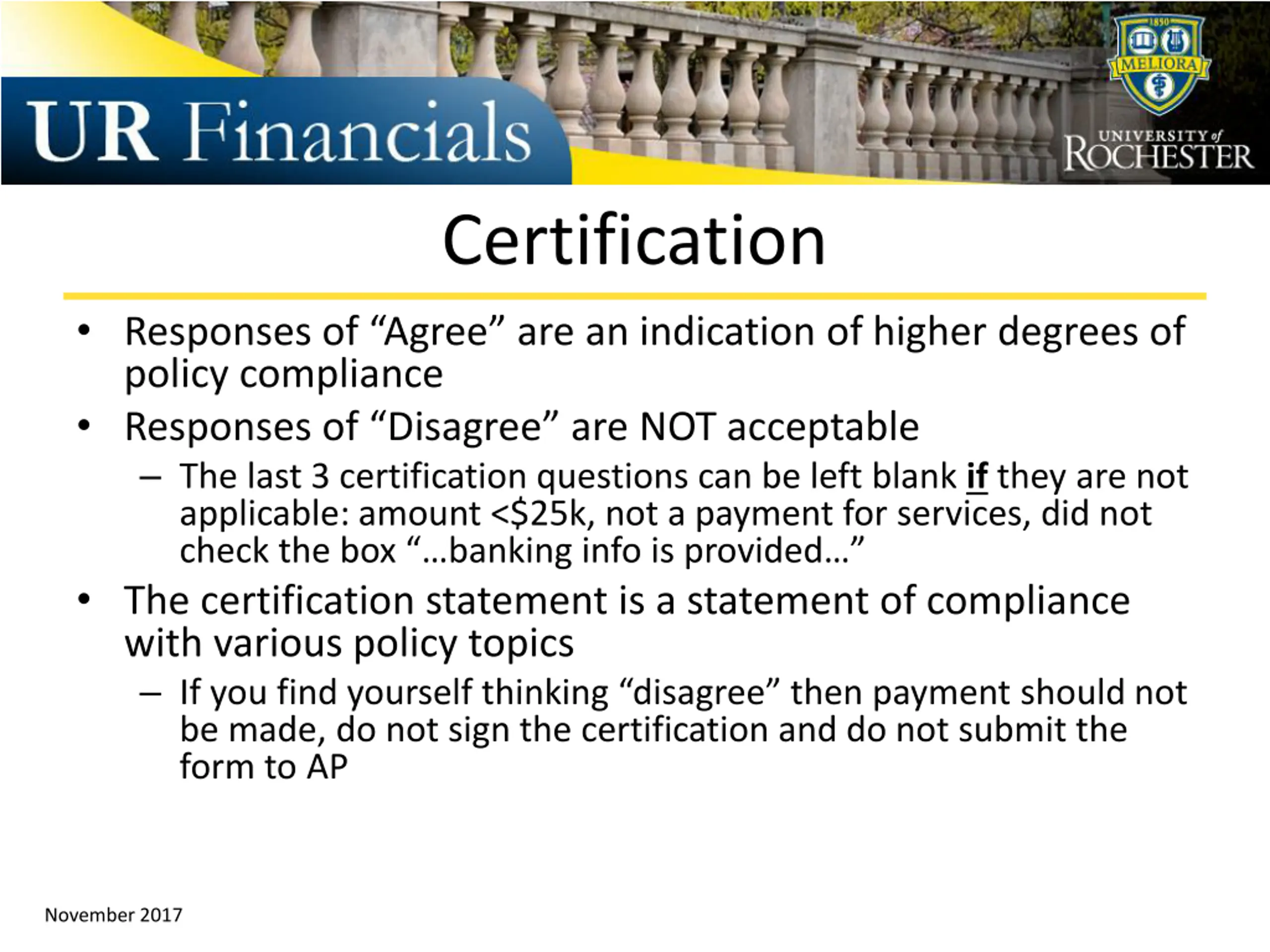Certification Responses of Agree are an indication of higher degrees of policy compliance Responses of Disagree are NOT acceptable The last 3 certification questions can be left blank if they are not applicable: amount <$25k, not a payment for services, did not check the box banking info is provided The certification statement is a statement of compliance with various policy topics If you find yourself thinking disagree then payment should not be made, do not sign the certification and do not submit the form to AP November 2017