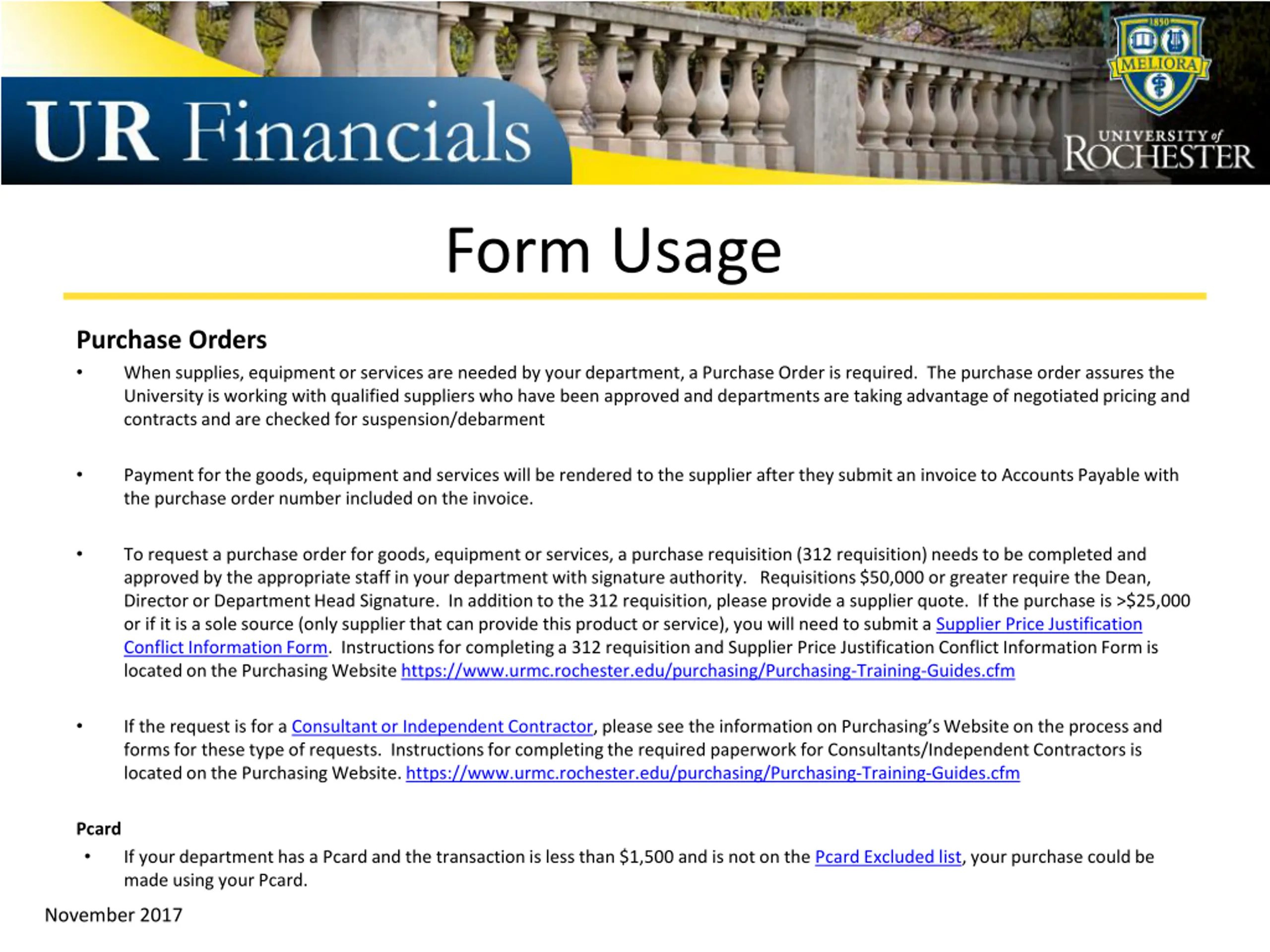 Form Usage Purchase Orders When supplies, equipment or services are needed by your department, a Purchase Order is required. The purchase order assures the University is working with qualified suppliers who have been approved and departments are taking advantage of negotiated pricing and contracts and are checked for suspension/debarment Payment for the goods, equipment and services will be rendered to the supplier after they submit an invoice to Accounts Payable with the purchase order number included on the invoice. To request a purchase order for goods, equipment or services, a purchase requisition (312 requisition) needs to be completed and approved by the appropriate staff in your department with signature authority. Requisitions $50,000 or greater require the Dean, Director or Department Head Signature. In addition to the 312 requisition, please provide a supplier quote. If the purchase is >$25,000 or if it is a sole source (only supplier that can provide this product or service), you will need to submit a Supplier Price Justification Conflict Information Form. Instructions for completing a 312 requisition and Supplier Price Justification Conflict Information Form is located on the Purchasing Website https://www.urmc.rochester.edu/purchasing/Purchasing-Training-Guides.cfm If the request is for a Consultant or Independent Contractor, please see the information on Purchasing s Website on the process and forms for these type of requests. Instructions for completing the required paperwork for Consultants/Independent Contractors is located on the Purchasing Website. https://www.urmc.rochester.edu/purchasing/Purchasing-Training-Guides.cfm Pcard If your department has a Pcard and the transaction is less than $1,500 and is not on the Pcard Excluded list, your purchase could be made using your Pcard. November 2017