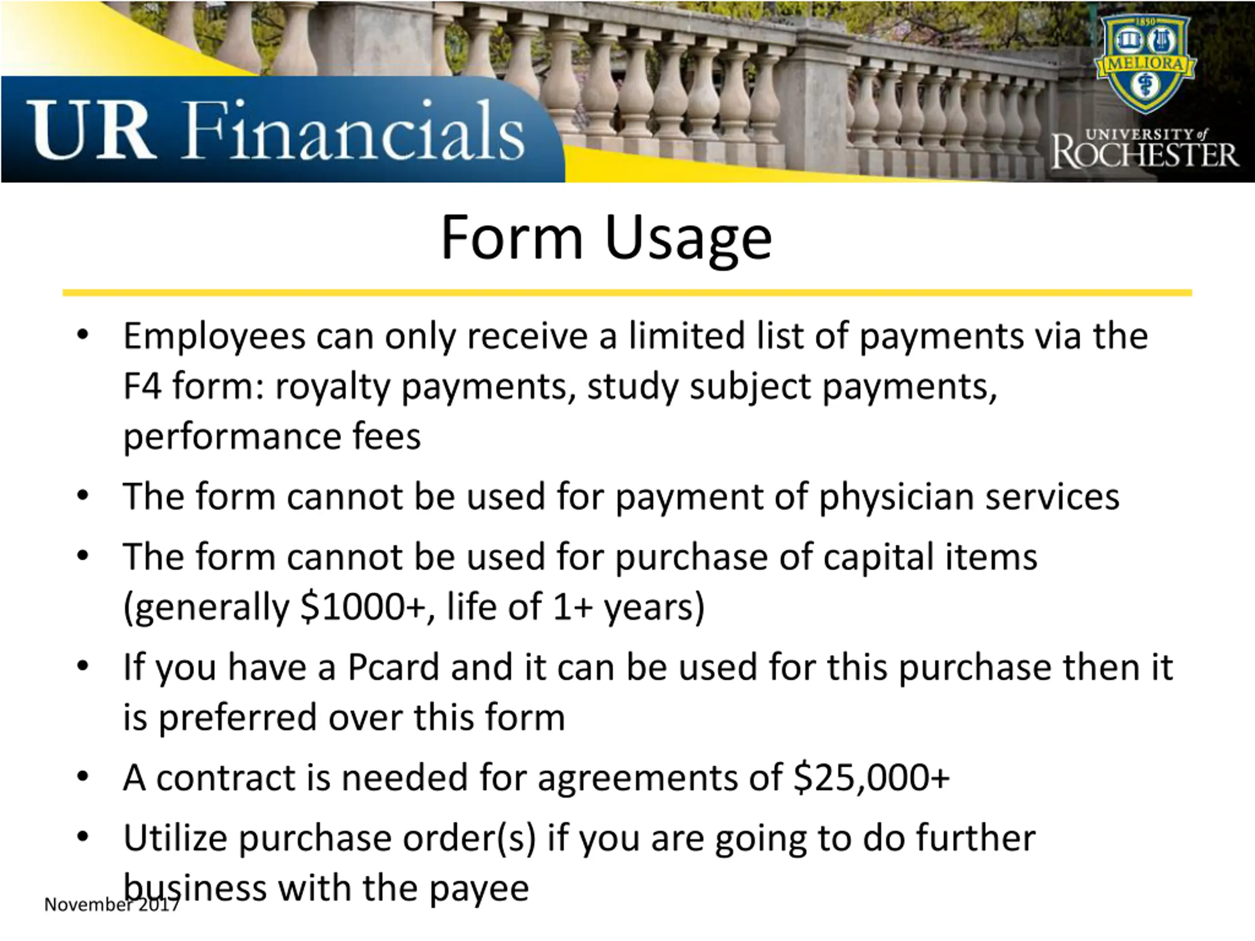 Form Usage Employees can only receive a limited list of payments via the F4 form: royalty payments, study subject payments, performance fees The form cannot be used for payment of physician services The form cannot be used for purchase of capital items (generally $1000+, life of 1+ years) If you have a Pcard and it can be used for this purchase then it is preferred over this form A contract is needed for agreements of $25,000+ Utilize purchase order(s) if you are going to do further business with the payee November 2017