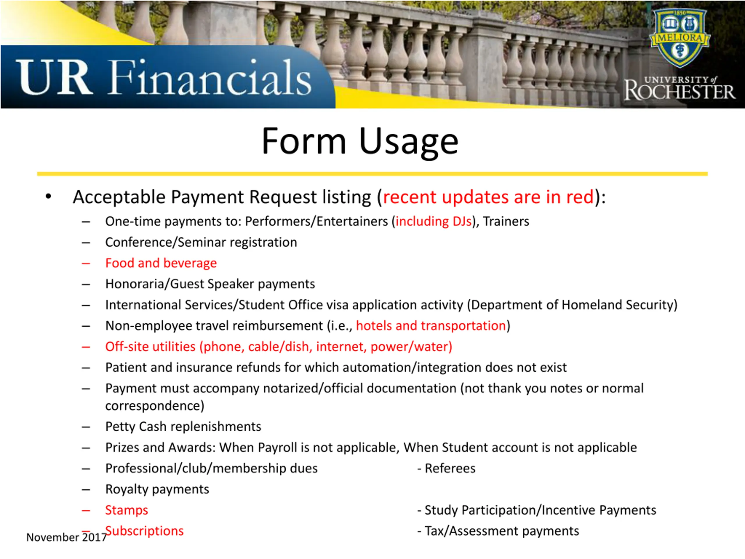 Form Usage Acceptable Payment Request listing (recent updates are in red): One-time payments to: Performers/Entertainers (including DJs), Trainers Conference/Seminar registration Food and beverage Honoraria/Guest Speaker payments International Services/Student Office visa application activity (Department of Homeland Security) Non-employee travel reimbursement (i.e., hotels and transportation) Off-site utilities (phone, cable/dish, internet, power/water) Patient and insurance refunds for which automation/integration does not exist Payment must accompany notarized/official documentation (not thank you notes or normal correspondence) Petty Cash replenishments Prizes and Awards: When Payroll is not applicable, When Student account is not applicable Professional/club/membership dues Royalty payments Stamps Subscriptions - Referees - Study Participation/Incentive Payments - Tax/Assessment payments November 2017