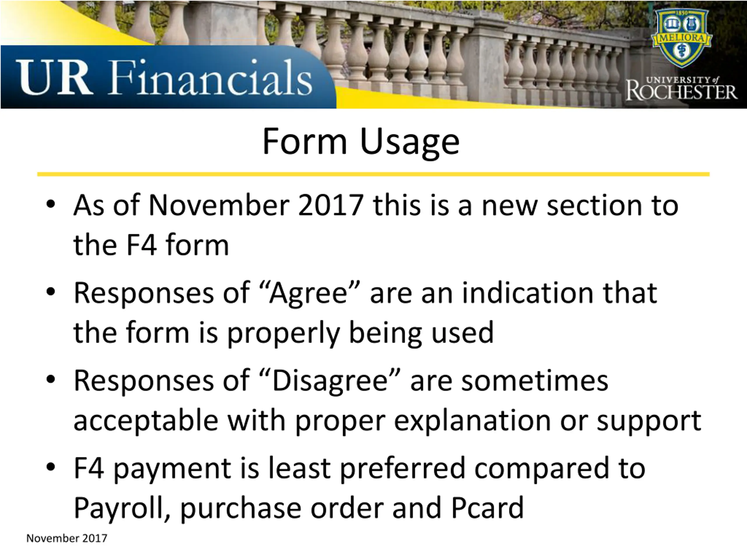 Form Usage As of November 2017 this is a new section to the F4 form Responses of Agree are an indication that the form is properly being used Responses of Disagree are sometimes acceptable with proper explanation or support F4 payment is least preferred compared to Payroll, purchase order and Pcard November 2017