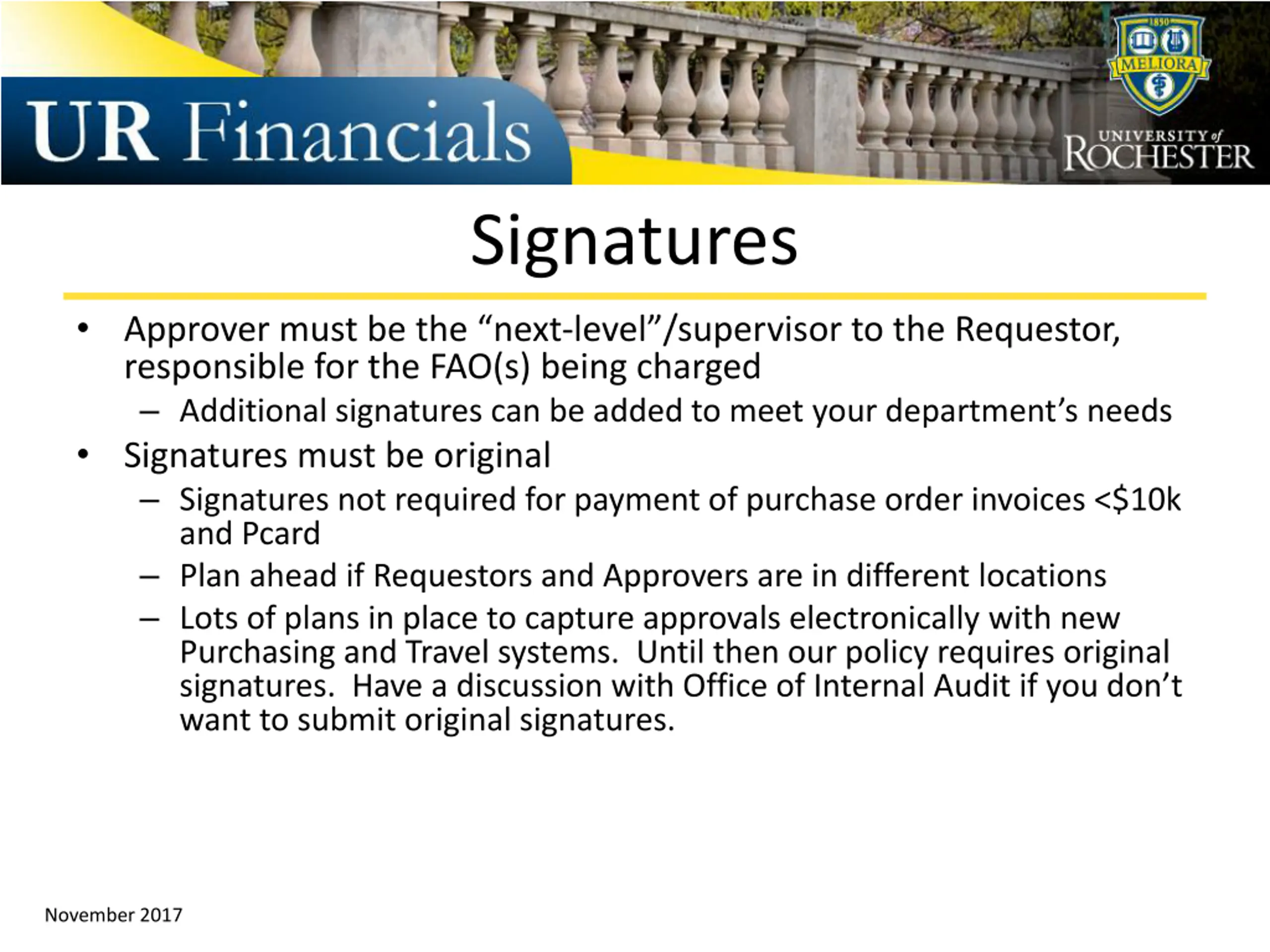 Signatures Approver must be the next-level /supervisor to the Requestor, responsible for the FAO(s) being charged Additional signatures can be added to meet your department s needs Signatures must be original Signatures not required for payment of purchase order invoices <$10k and Pcard Plan ahead if Requestors and Approvers are in different locations Lots of plans in place to capture approvals electronically with new Purchasing and Travel systems. Until then our policy requires original signatures. Have a discussion with Office of Internal Audit if you don t want to submit original signatures. November 2017