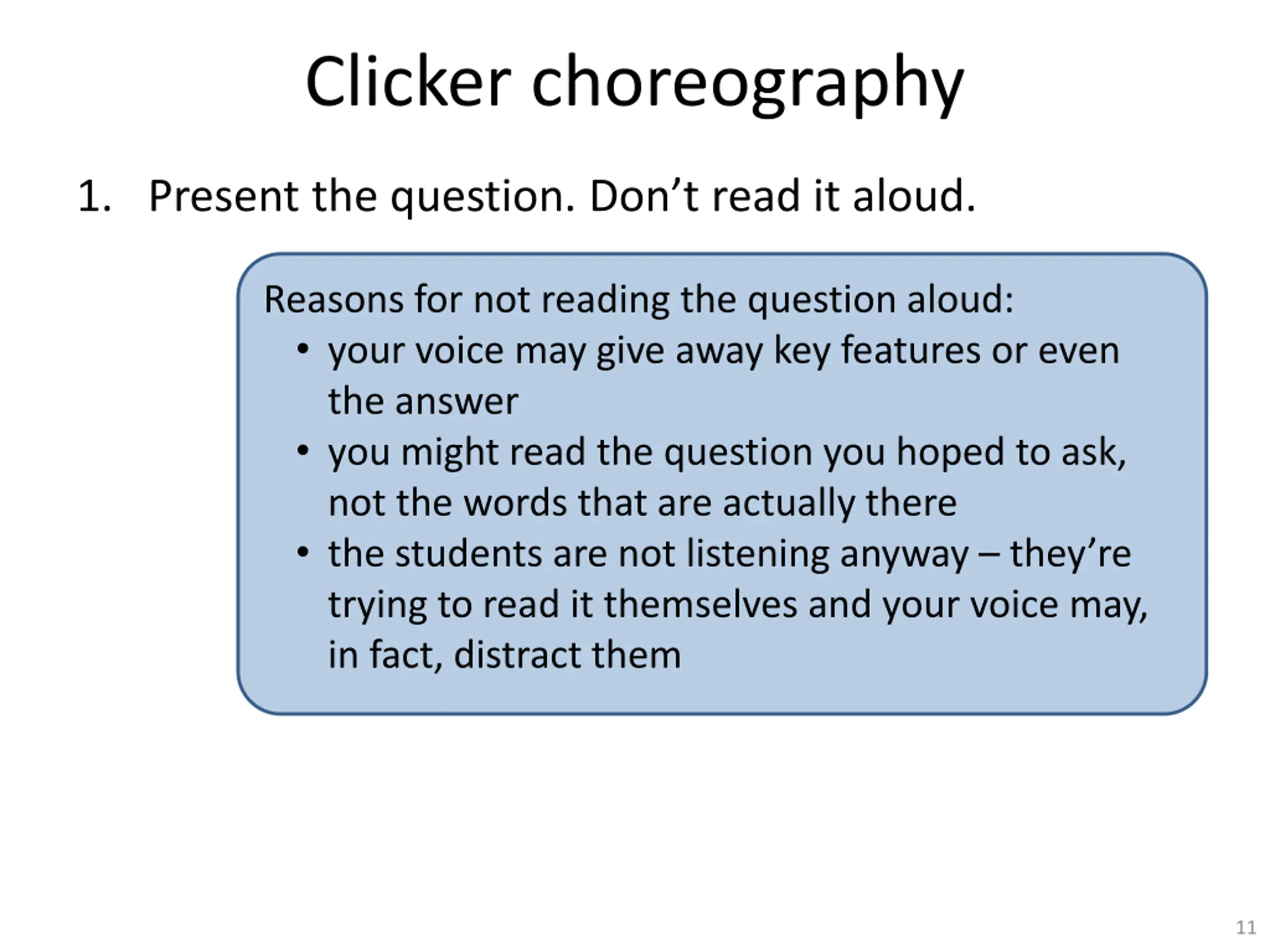 Clicker choreography 1. Present the question. Don t read it aloud. Reasons for not reading the question aloud: your voice may give away key features or even the answer you might read the question you hoped to ask, not the words that are actually there the students are not listening anyway they re trying to read it themselves and your voice may, in fact, distract them 11