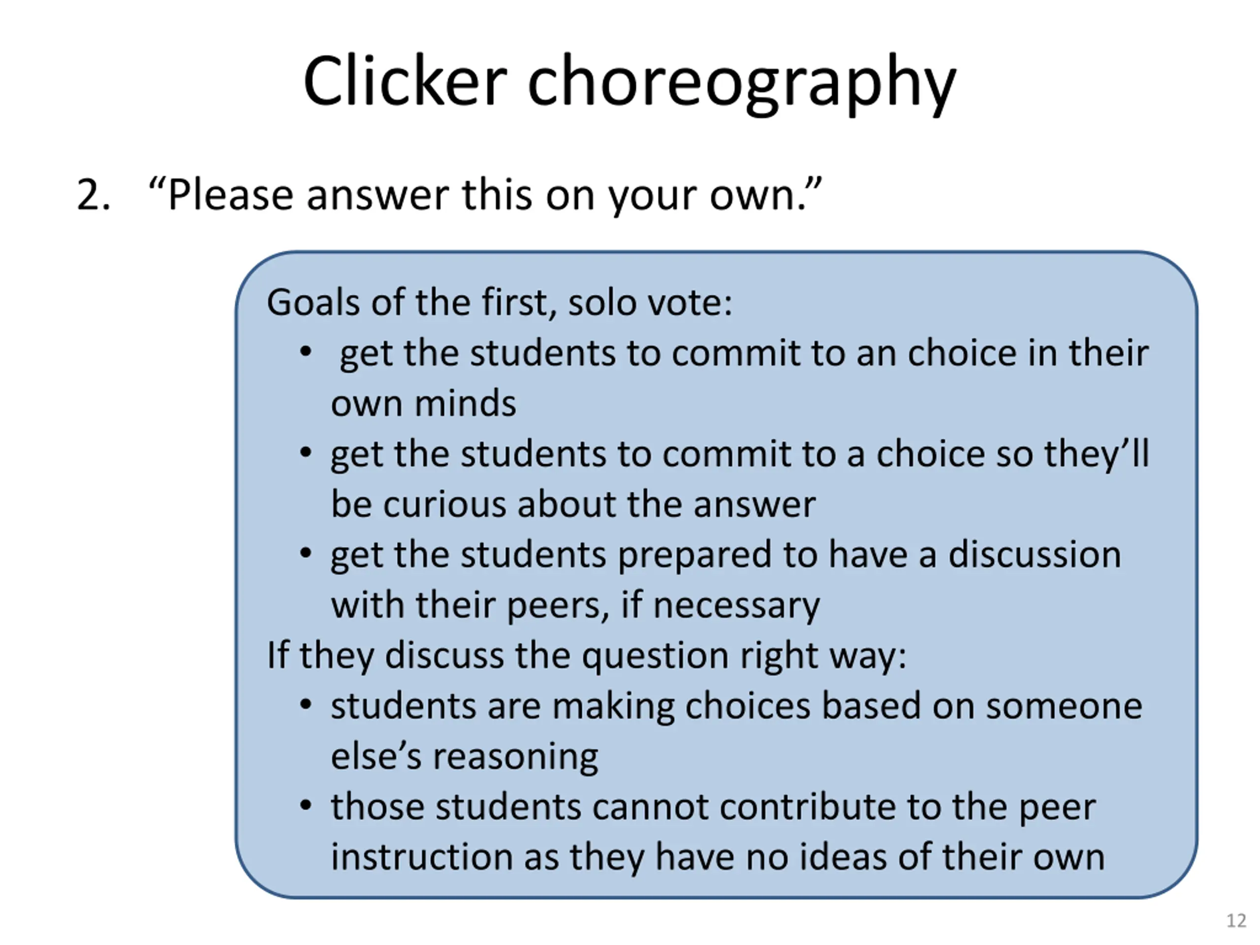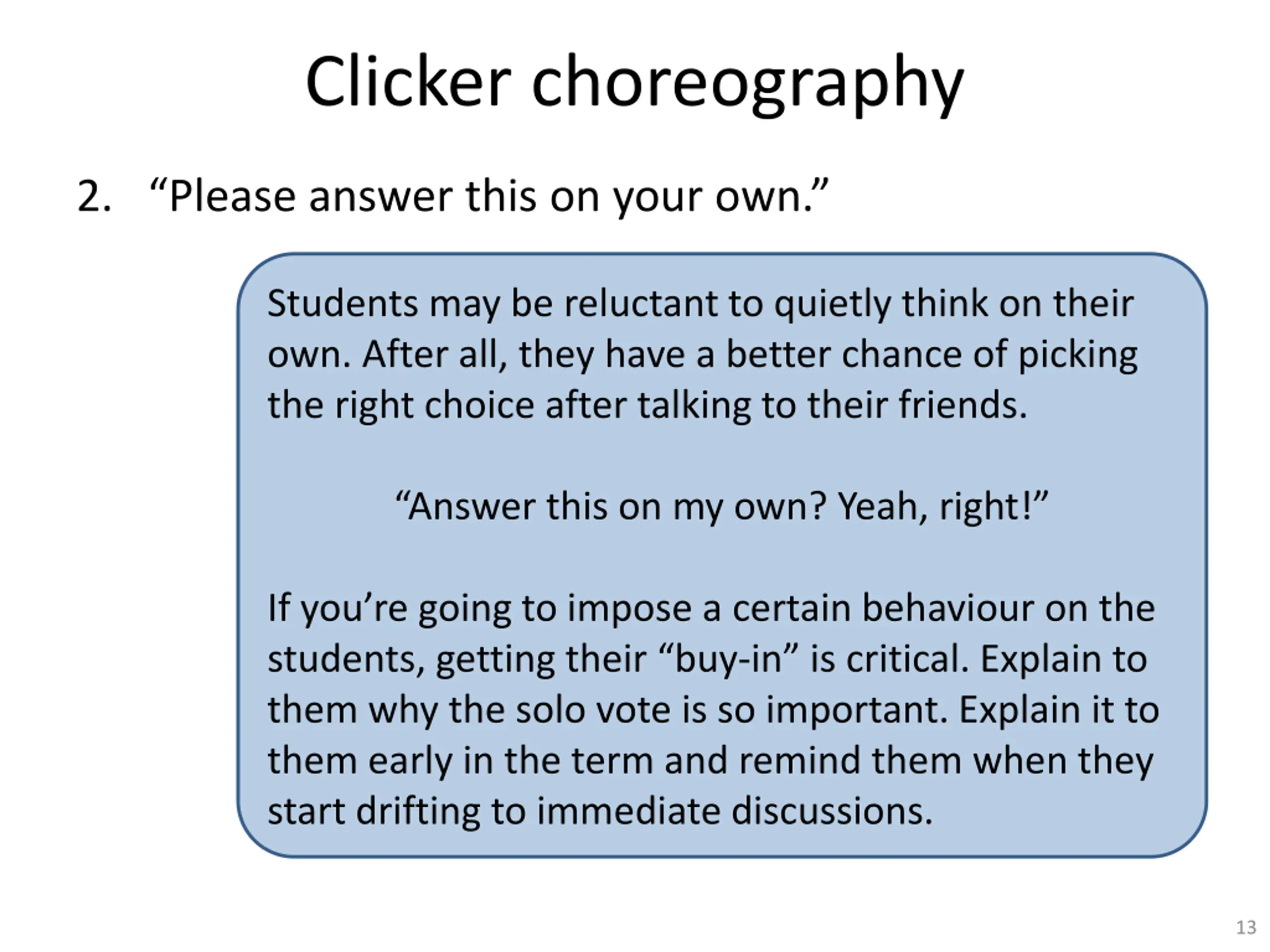 Clicker choreography 2. Please answer this on your own. Students may be reluctant to quietly think on their own. After all, they have a better chance of picking the right choice after talking to their friends. Answer this on my own? Yeah, right! If you re going to impose a certain behaviour on the students, getting their buy-in is critical. Explain to them why the solo vote is so important. Explain it to them early in the term and remind them when they start drifting to immediate discussions. 13