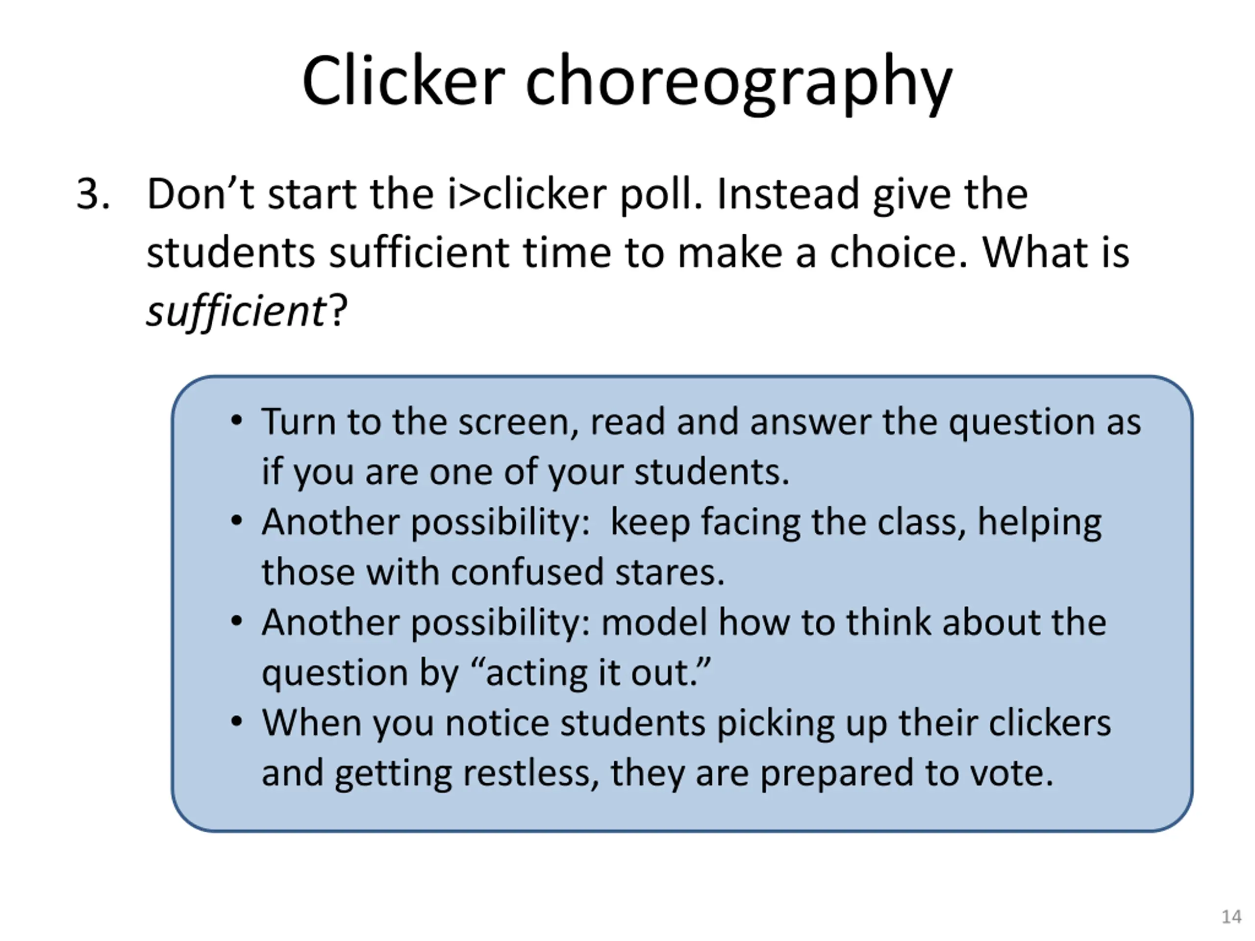 Clicker choreography 3. Don t start the i>clicker poll. Instead give the students sufficient time to make a choice. What is sufficient? Turn to the screen, read and answer the question as if you are one of your students. Another possibility: keep facing the class, helping those with confused stares. Another possibility: model how to think about the question by acting it out. When you notice students picking up their clickers and getting restless, they are prepared to vote. 14