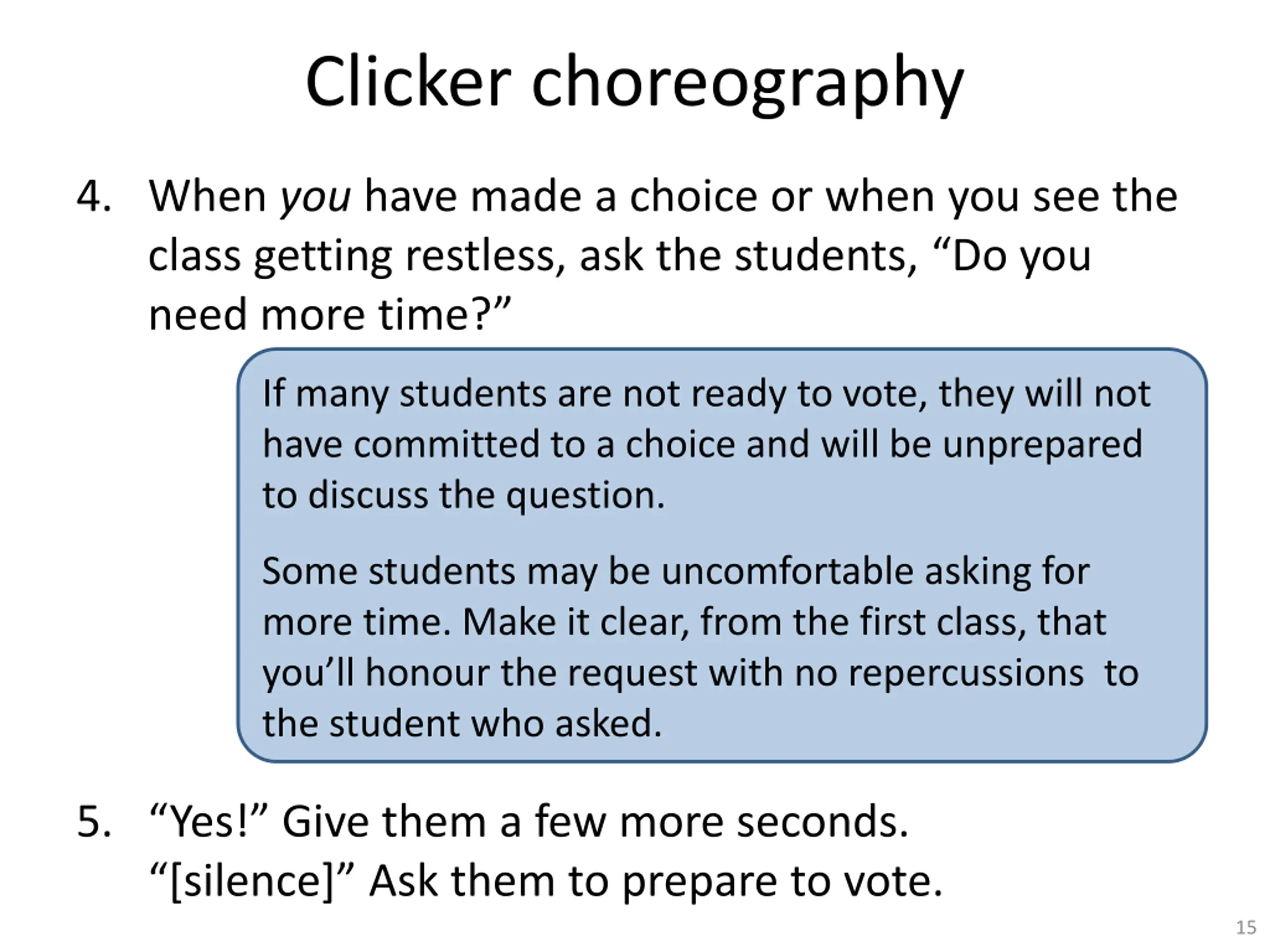 Clicker choreography 4. When you have made a choice or when you see the class getting restless, ask the students, Do you need more time? If many students are not ready to vote, they will not have committed to a choice and will be unprepared to discuss the question. Some students may be uncomfortable asking for more time. Make it clear, from the first class, that you ll honour the request with no repercussions to the student who asked. 5. Yes! Give them a few more seconds. [silence] Ask them to prepare to vote. 15