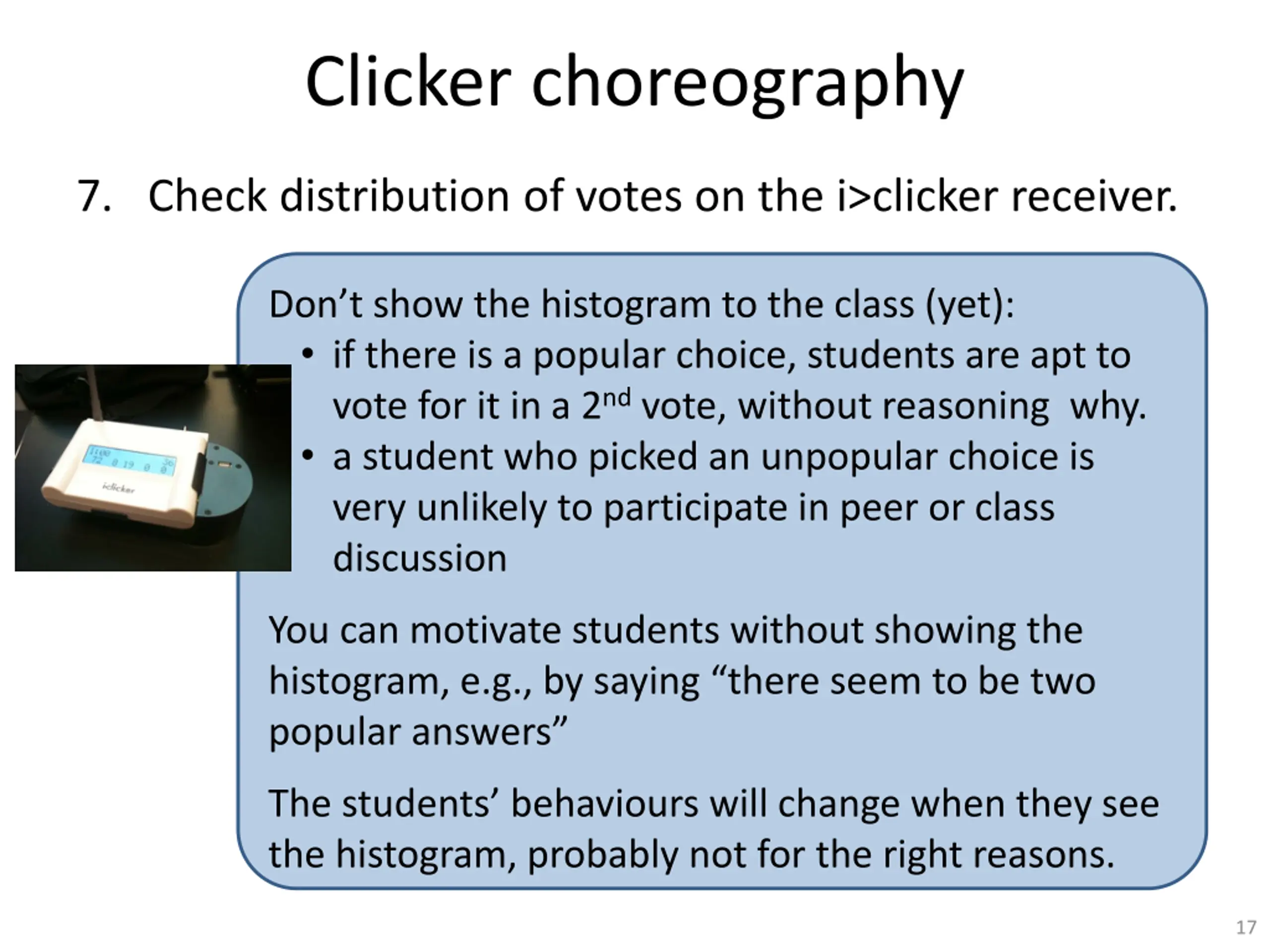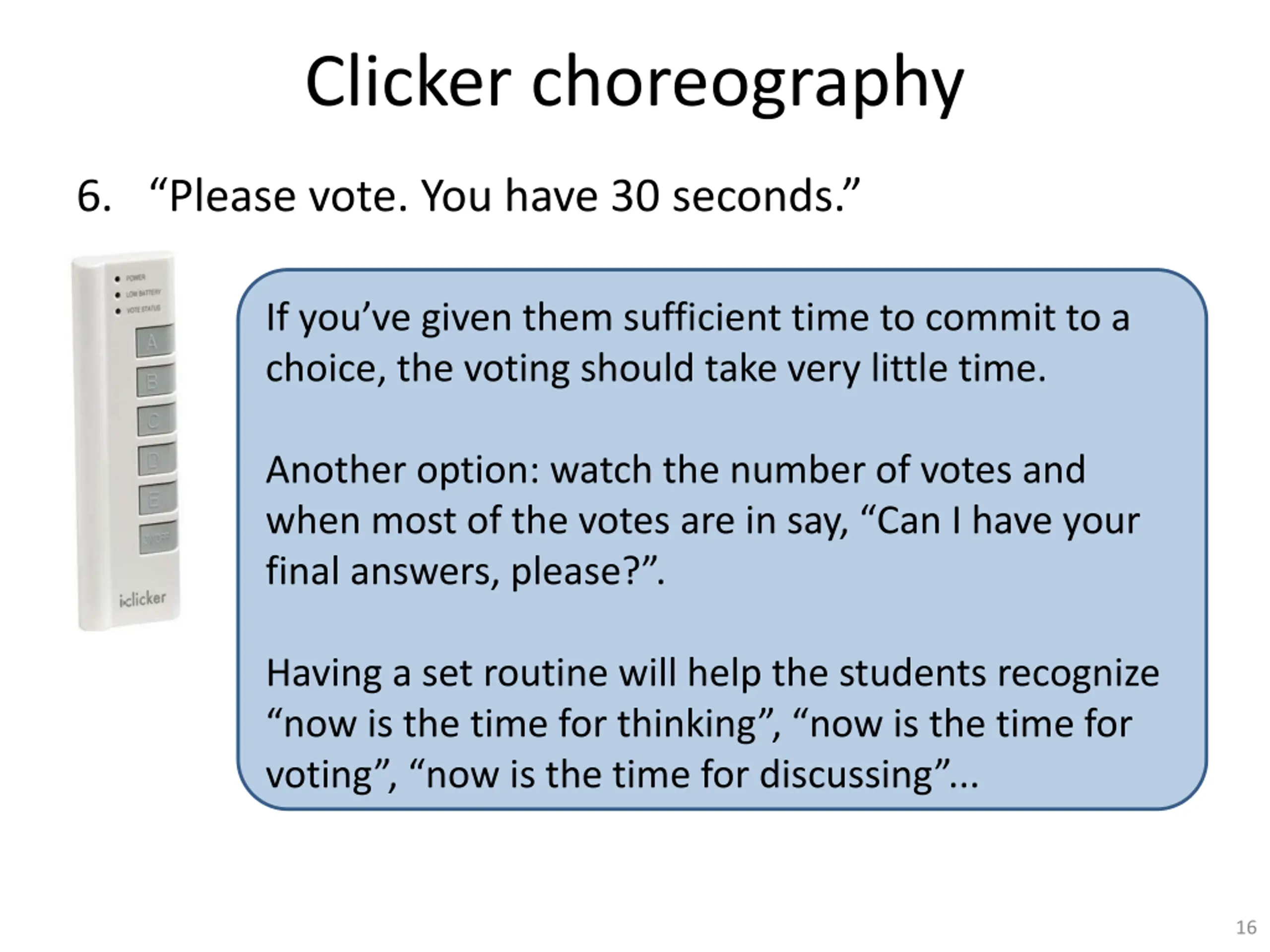 Clicker choreography 6. Please vote. You have 30 seconds. If you ve given them sufficient time to commit to a choice, the voting should take very little time. Another option: watch the number of votes and when most of the votes are in say, Can I have your final answers, please? . Having a set routine will help the students recognize now is the time for thinking , now is the time for voting , now is the time for discussing ... 16