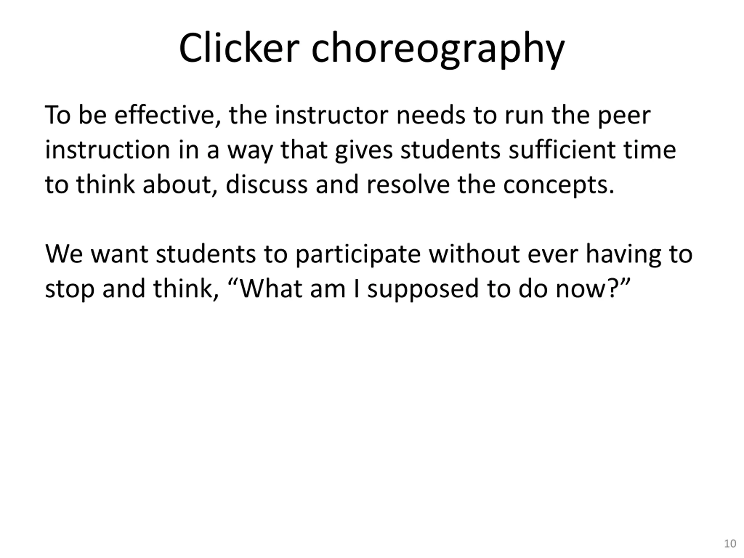 Clicker choreography To be effective, the instructor needs to run the peer instruction in a way that gives students sufficient time to think about, discuss and resolve the concepts. We want students to participate without ever having to stop and think, What am I supposed to do now? 10
