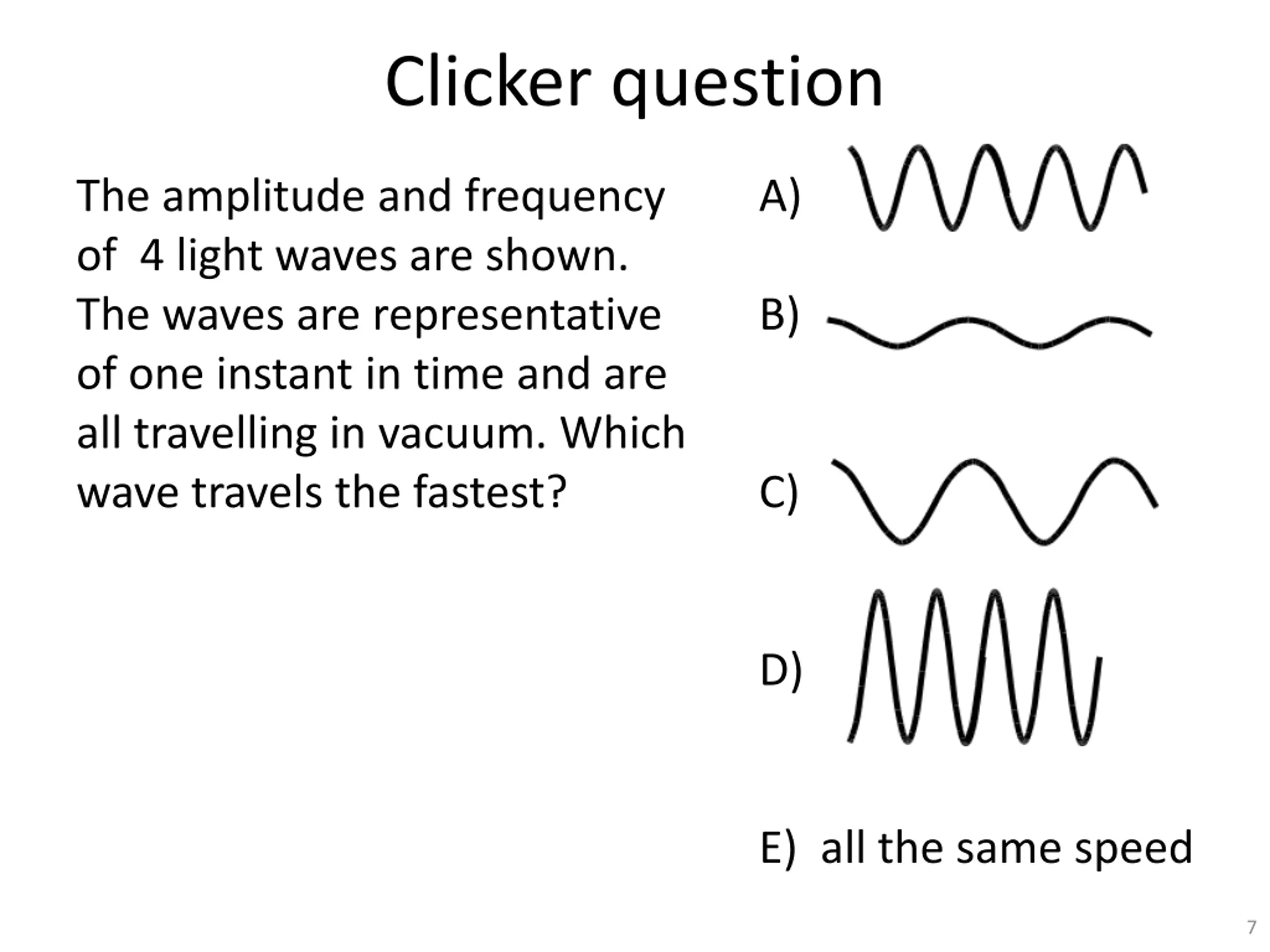 Clicker question The amplitude and frequency of 4 light waves are shown. The waves are representative of one instant in time and are all travelling in vacuum. Which wave travels the fastest? A) B) C) D) E) all the same speed 7