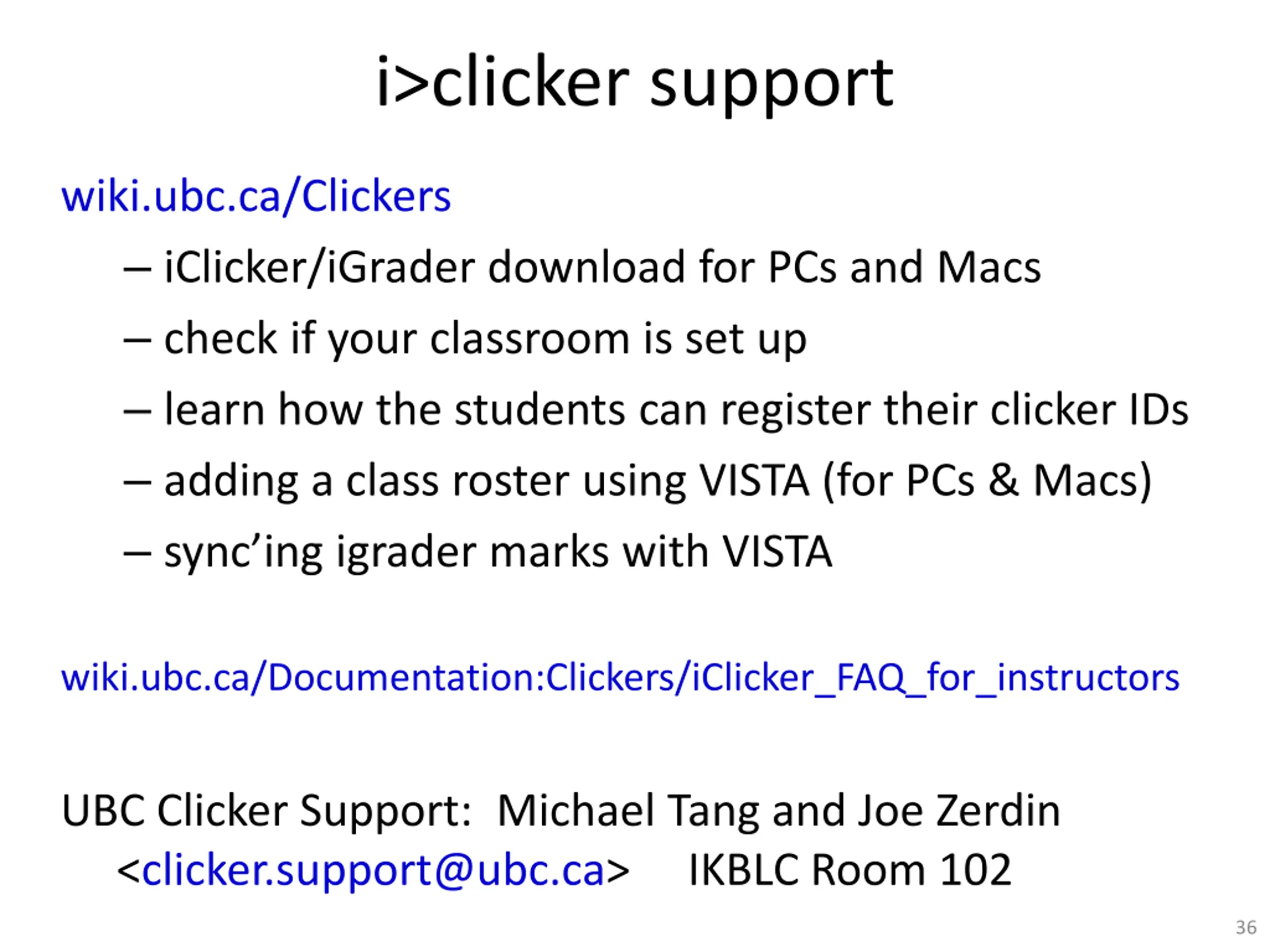 i>clicker support wiki.ubc.ca/Clickers iClicker/iGrader download for PCs and Macs check if your classroom is set up learn how the students can register their clicker IDs adding a class roster using VISTA (for PCs & Macs) sync ing igrader marks with VISTA wiki.ubc.ca/Documentation:Clickers/iClicker_FAQ_for_instructors UBC Clicker Support: Michael Tang and Joe Zerdin <clicker.support@ubc.ca> IKBLC Room 102 36