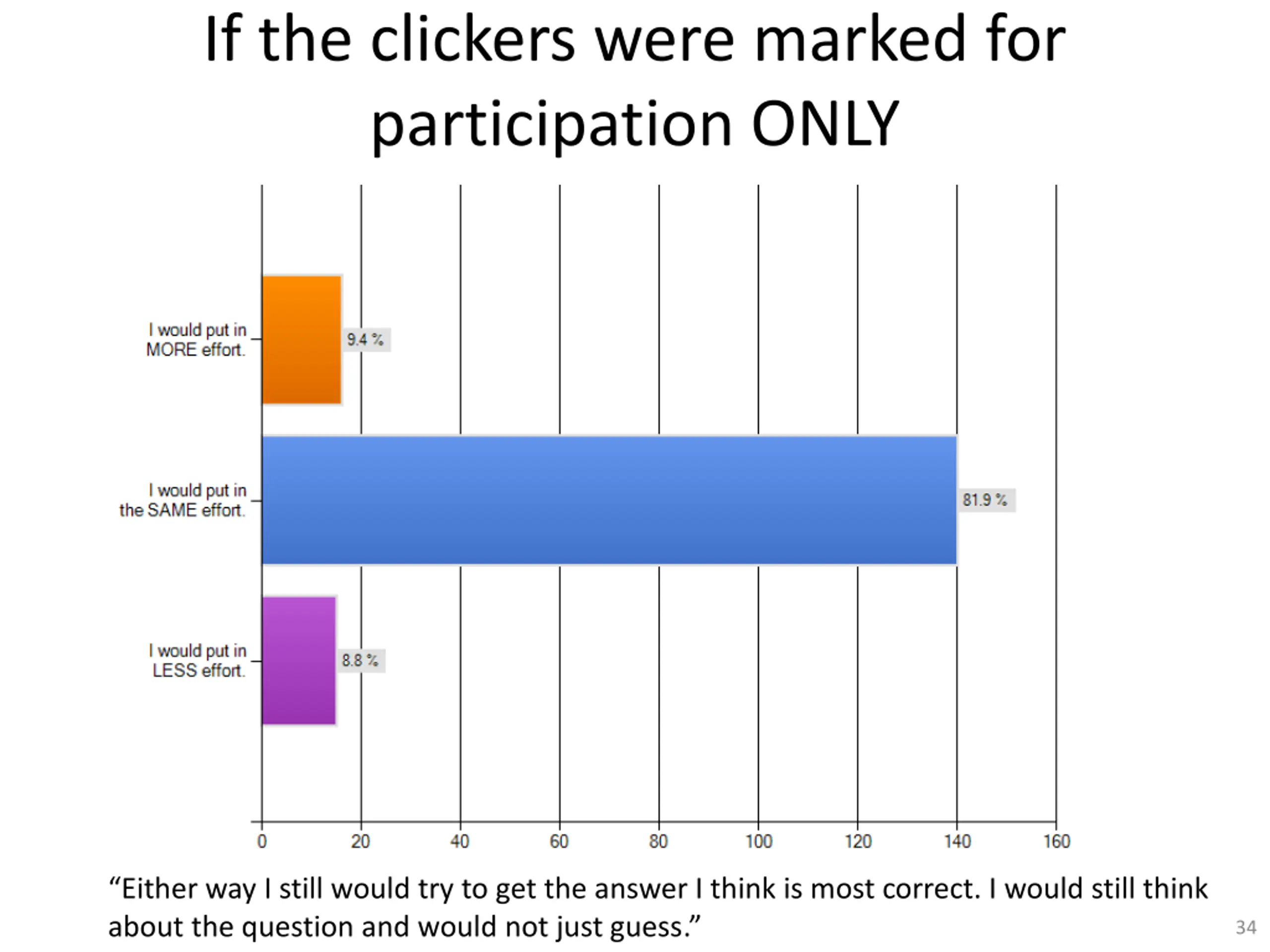 high If you believe peer instruction is important for learning and you expect students to engage, you can reward their effort. Student engagement (and learning) However, if students perceive clickers are used to test for failure or simply to take attendance, they will disengage. low none participation correct Clicker points 33