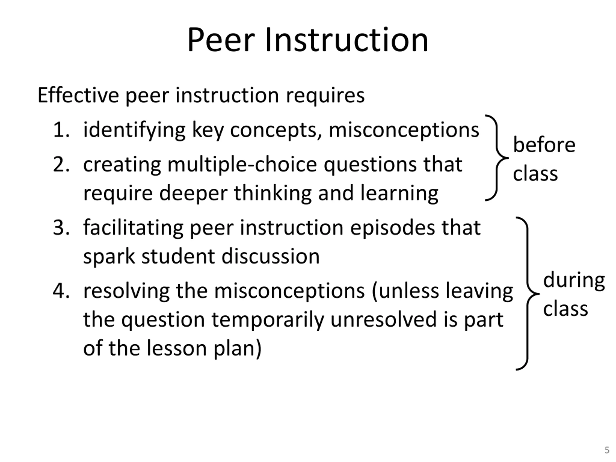 Peer Instruction Effective peer instruction requires 1. identifying key concepts, misconceptions 2. creating multiple-choice questions that require deeper thinking and learning 3. facilitating peer instruction episodes that spark student discussion 4. resolving the misconceptions (unless leaving the question temporarily unresolved is part of the lesson plan) before class during class 5