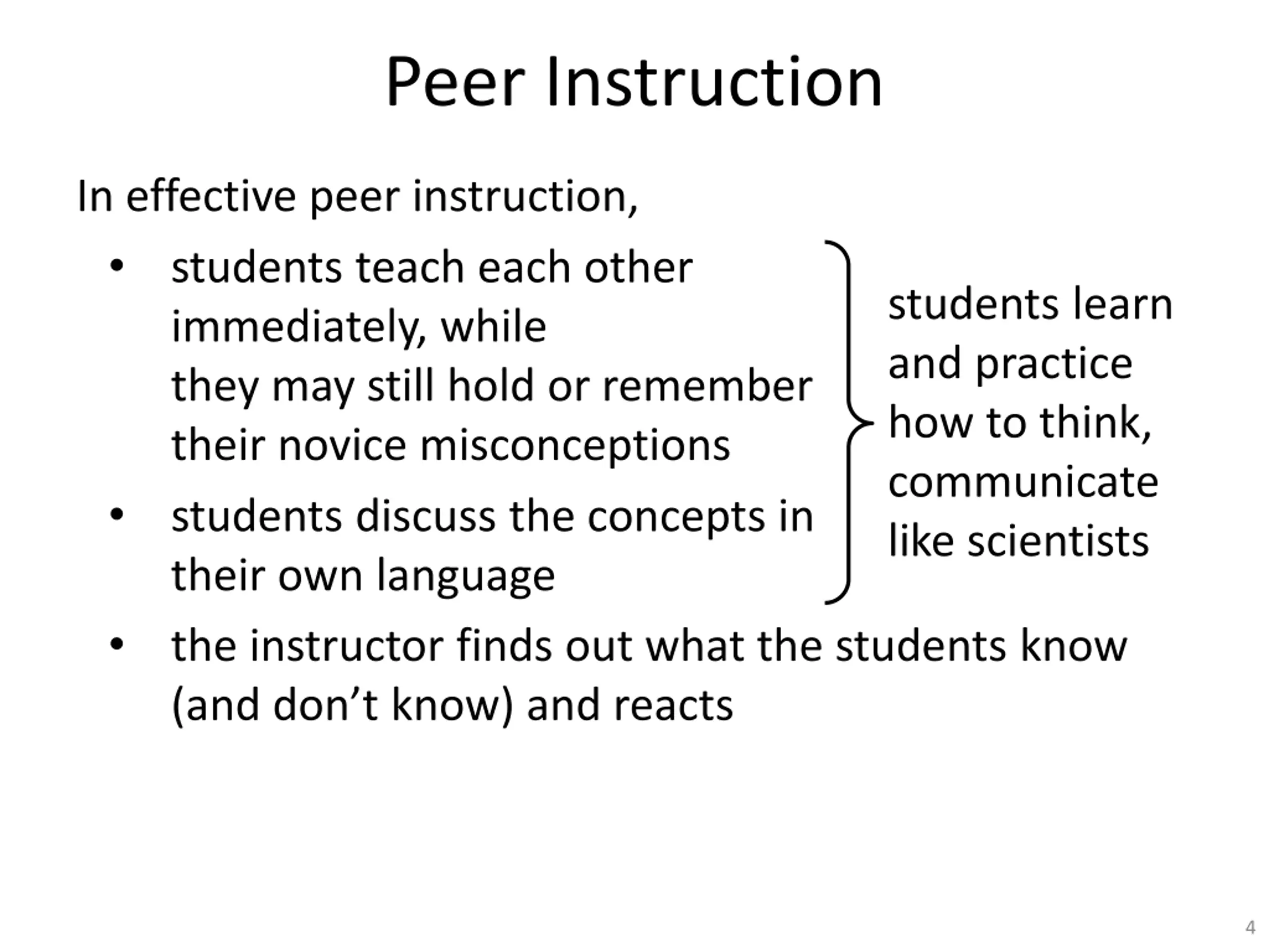 Peer Instruction In effective peer instruction, students teach each other immediately, while they may still hold or remember their novice misconceptions students discuss the concepts in their own language the instructor finds out what the students know (and don t know) and reacts students learn and practice how to think, communicate like scientists 4