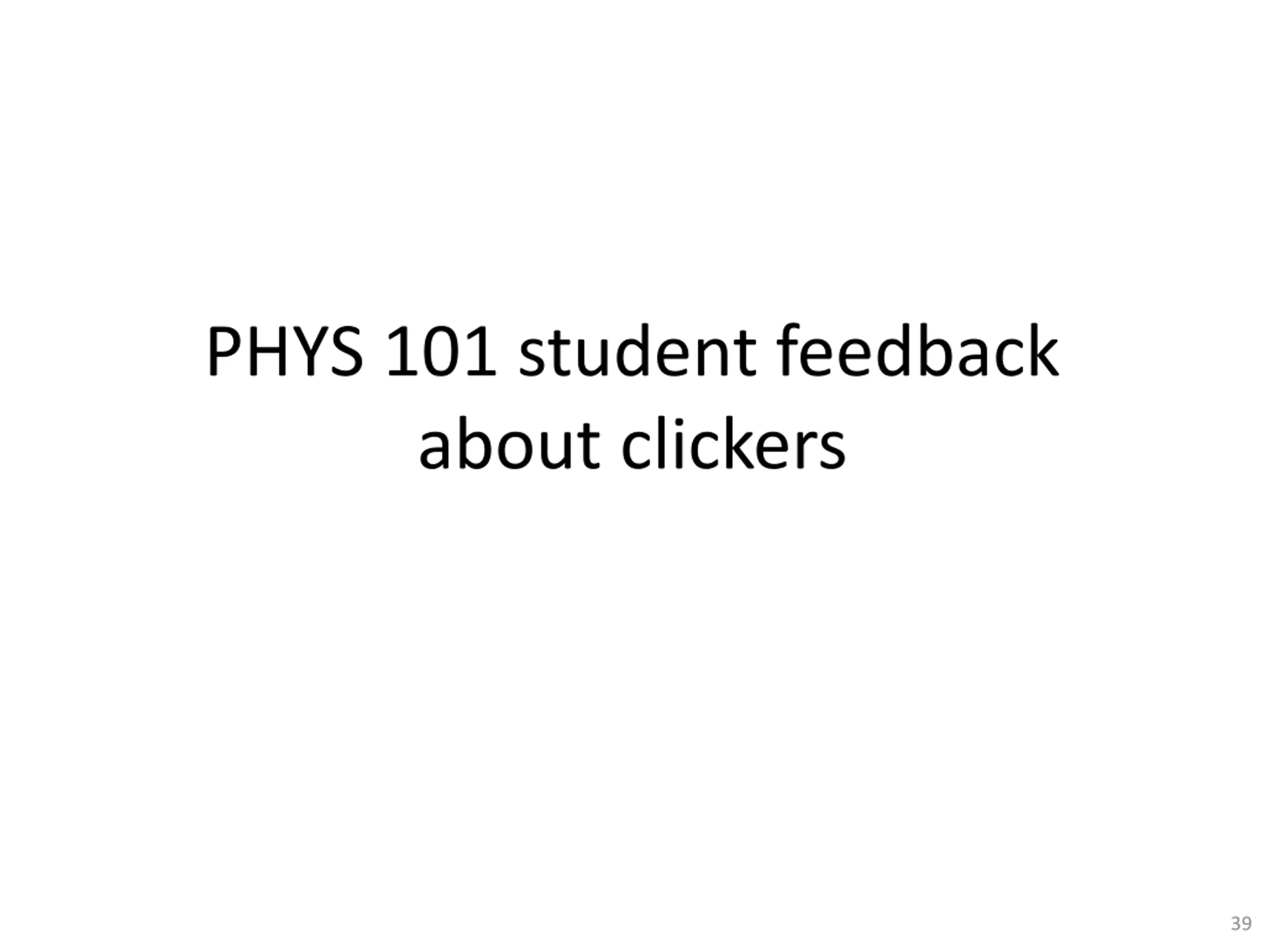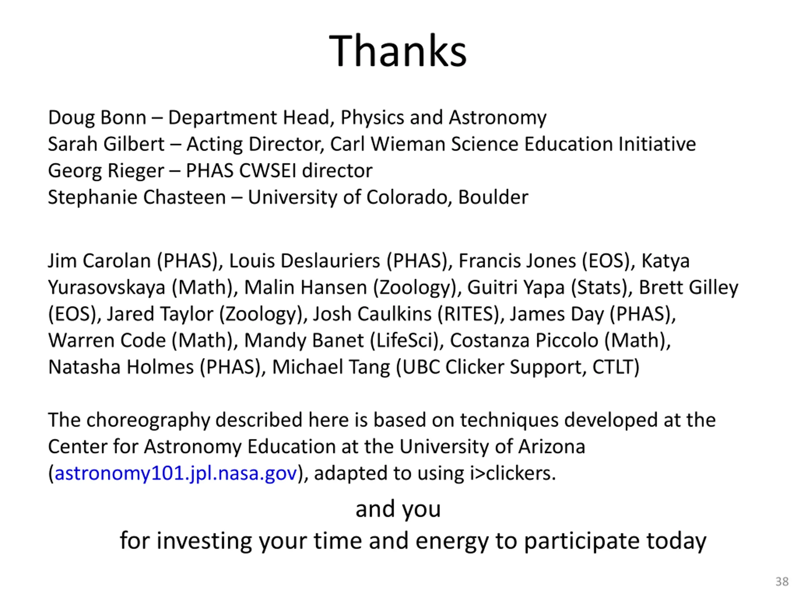 Thanks Doug Bonn Department Head, Physics and Astronomy Sarah Gilbert Acting Director, Carl Wieman Science Education Initiative Georg Rieger PHAS CWSEI director Stephanie Chasteen University of Colorado, Boulder Jim Carolan (PHAS), Louis Deslauriers (PHAS), Francis Jones (EOS), Katya Yurasovskaya (Math), Malin Hansen (Zoology), Guitri Yapa (Stats), Brett Gilley (EOS), Jared Taylor (Zoology), Josh Caulkins (RITES), James Day (PHAS), Warren Code (Math), Mandy Banet (LifeSci), Costanza Piccolo (Math), Natasha Holmes (PHAS), Michael Tang (UBC Clicker Support, CTLT) The choreography described here is based on techniques developed at the Center for Astronomy Education at the University of Arizona (astronomy101.jpl.nasa.gov), adapted to using i>clickers. and you for investing your time and energy to participate today 38