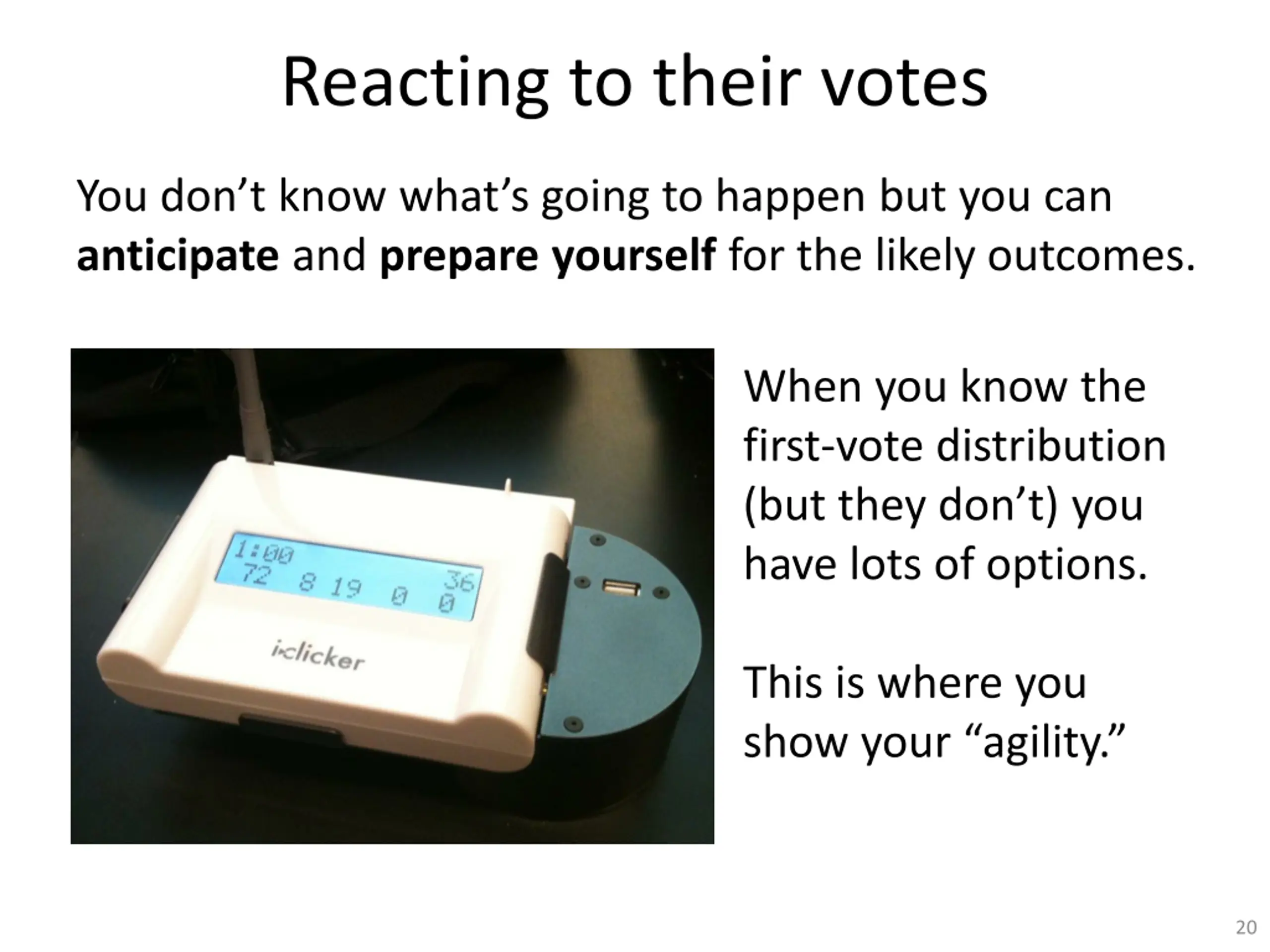 Reacting to their votes You don t know what s going to happen but you can anticipate and prepare yourself for the likely outcomes. When you know the first-vote distribution (but they don t) you have lots of options. This is where you show your agility. 20