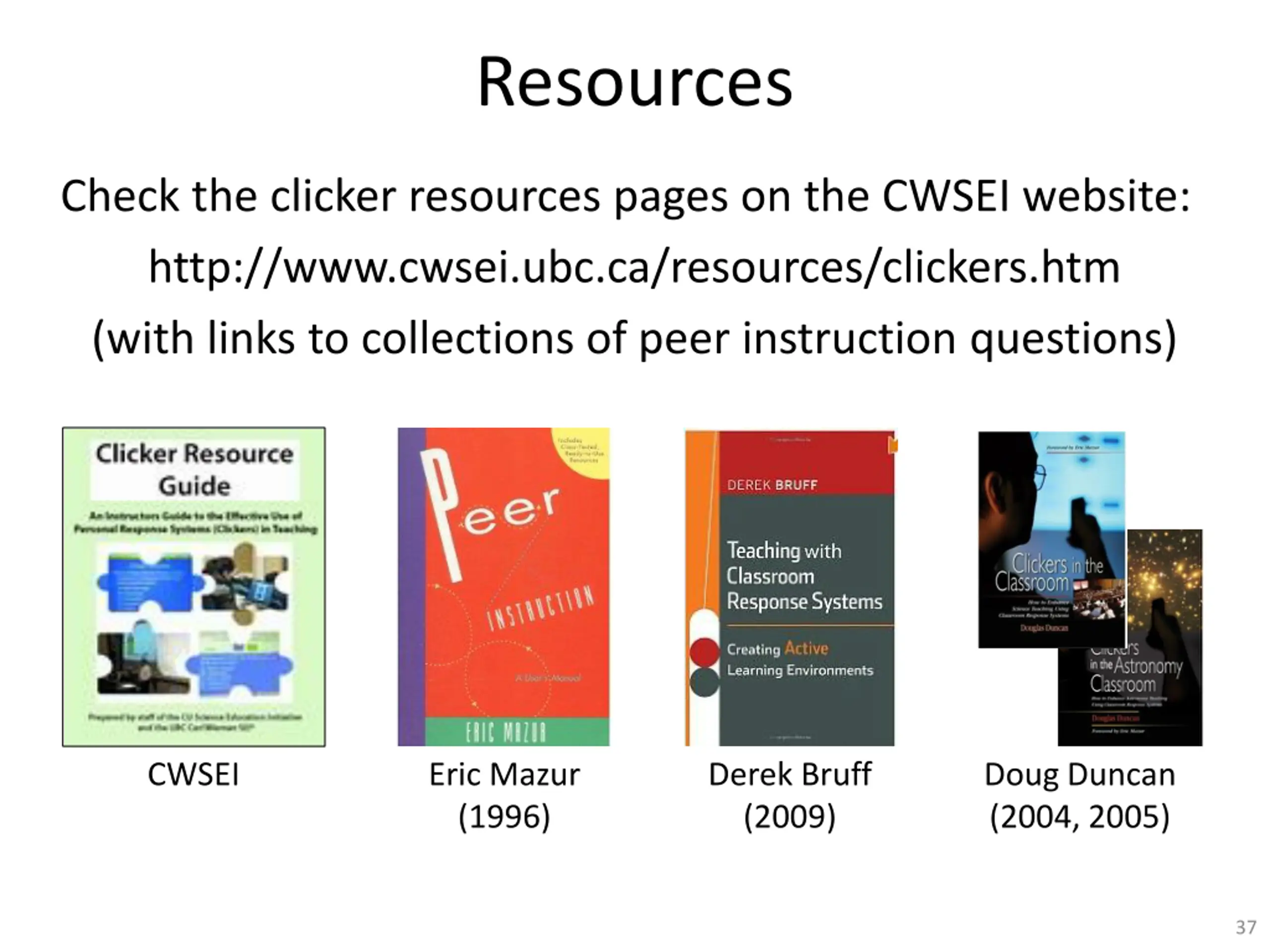 Resources Check the clicker resources pages on the CWSEI website: http://www.cwsei.ubc.ca/resources/clickers.htm (with links to collections of peer instruction questions) CWSEI Eric Mazur (1996) Derek Bruff (2009) Doug Duncan (2004, 2005) 37