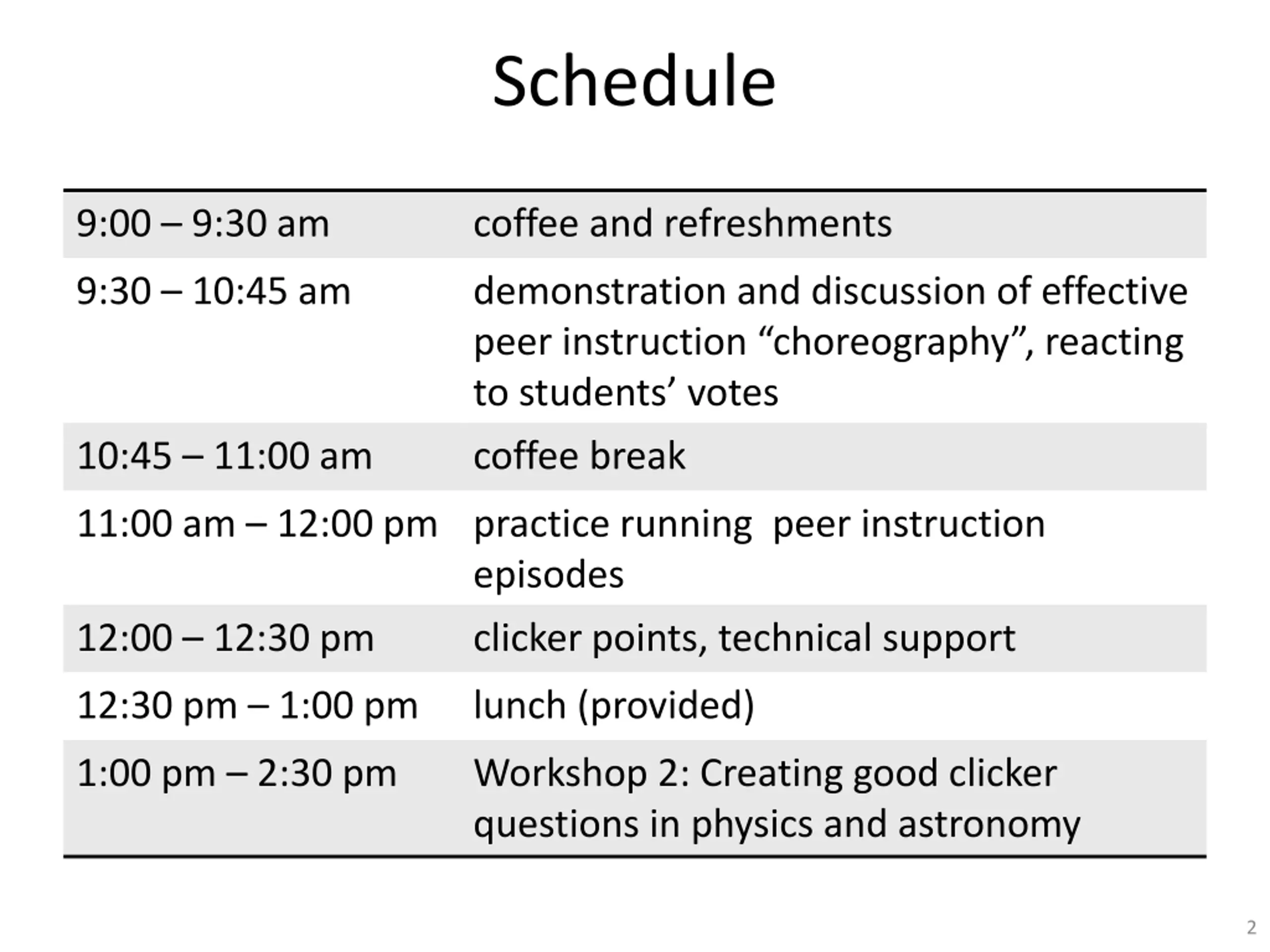 Schedule 9:00 9:30 am coffee and refreshments 9:30 10:45 am demonstration and discussion of effective peer instruction choreography , reacting to students votes coffee break 10:45 11:00 am 11:00 am 12:00 pm practice running peer instruction episodes 12:00 12:30 pm clicker points, technical support 12:30 pm 1:00 pm lunch (provided) 1:00 pm 2:30 pm Workshop 2: Creating good clicker questions in physics and astronomy 2