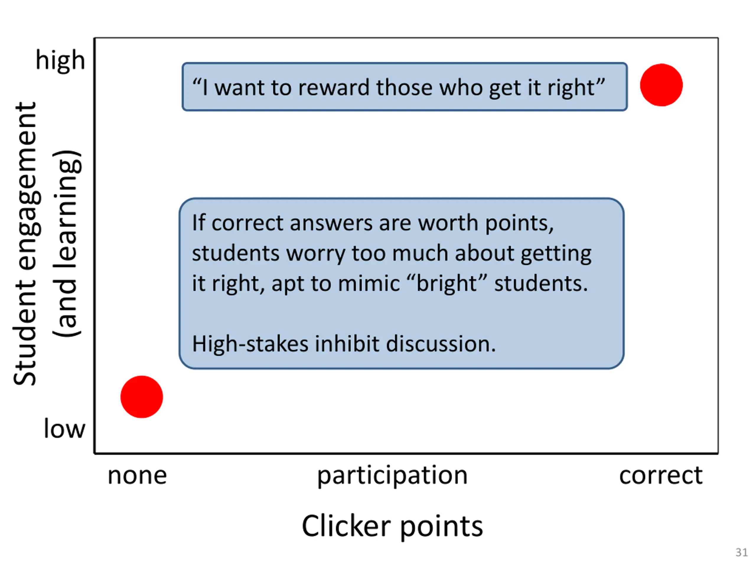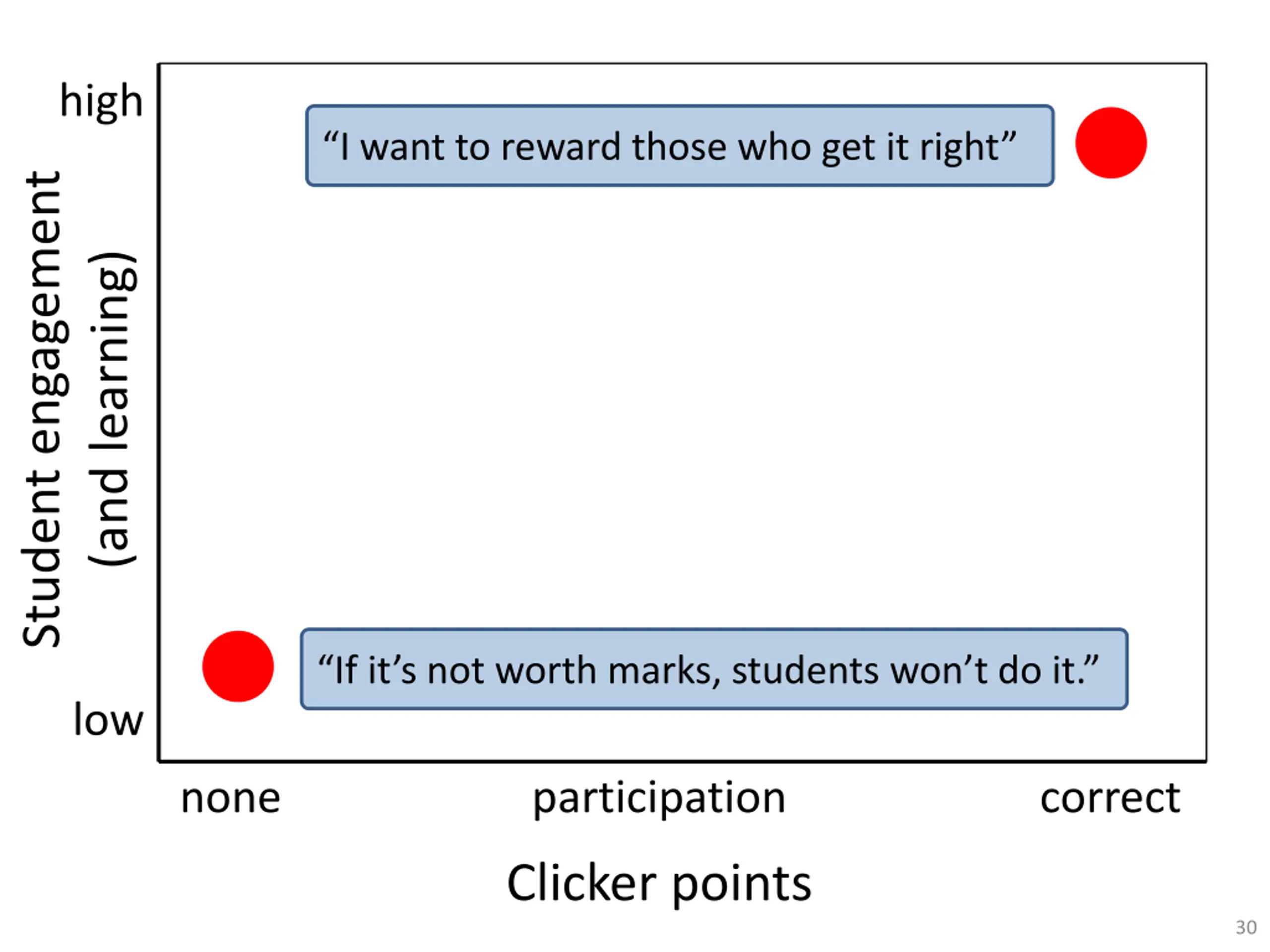 high I want to reward those who get it right Student engagement (and learning) If it s not worth marks, students won t do it. low none participation correct Clicker points 30