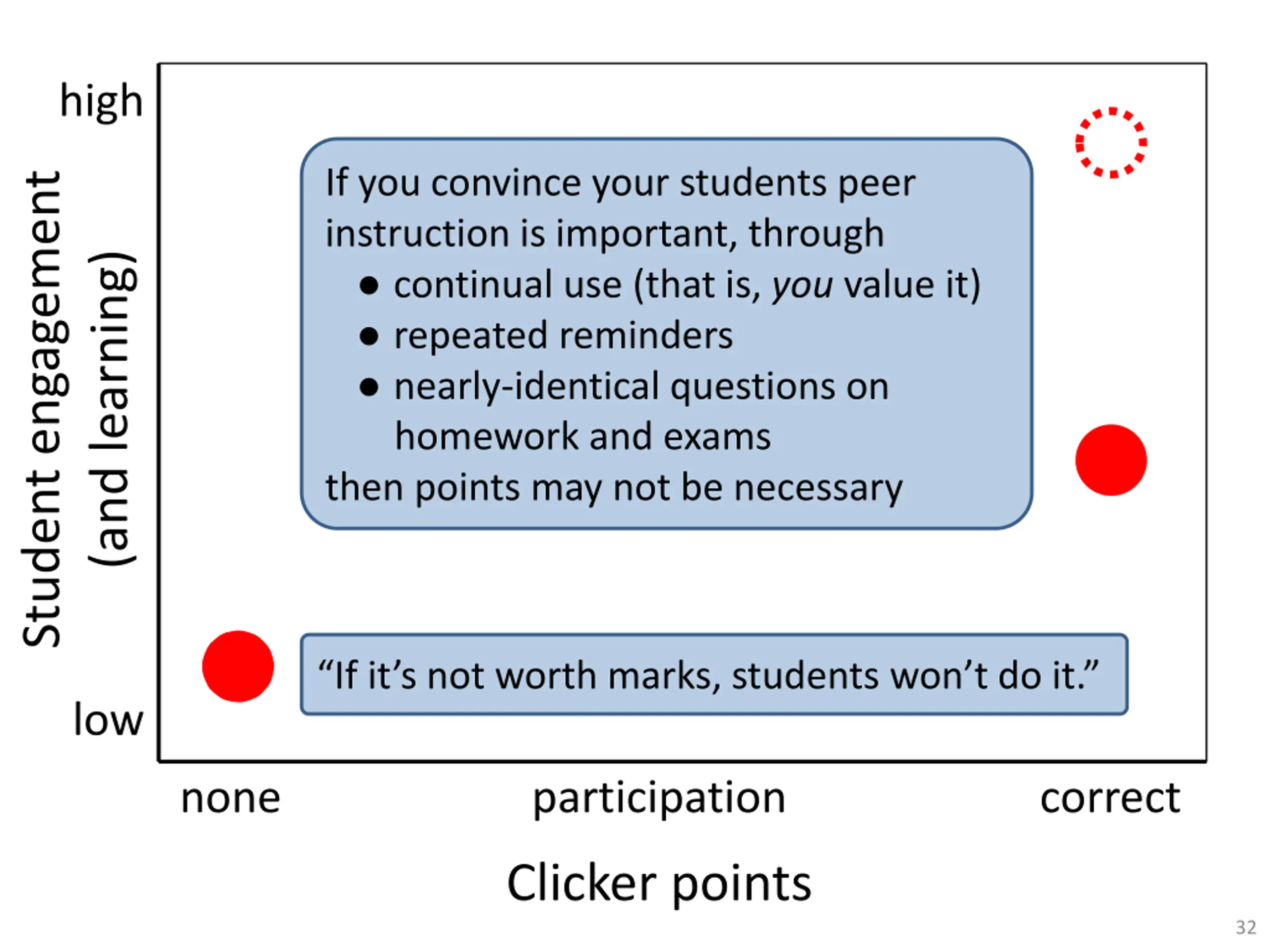 high If you convince your students peer instruction is important, through continual use (that is, you value it) repeated reminders nearly-identical questions on homework and exams then points may not be necessary Student engagement (and learning) If it s not worth marks, students won t do it. low none participation correct Clicker points 32