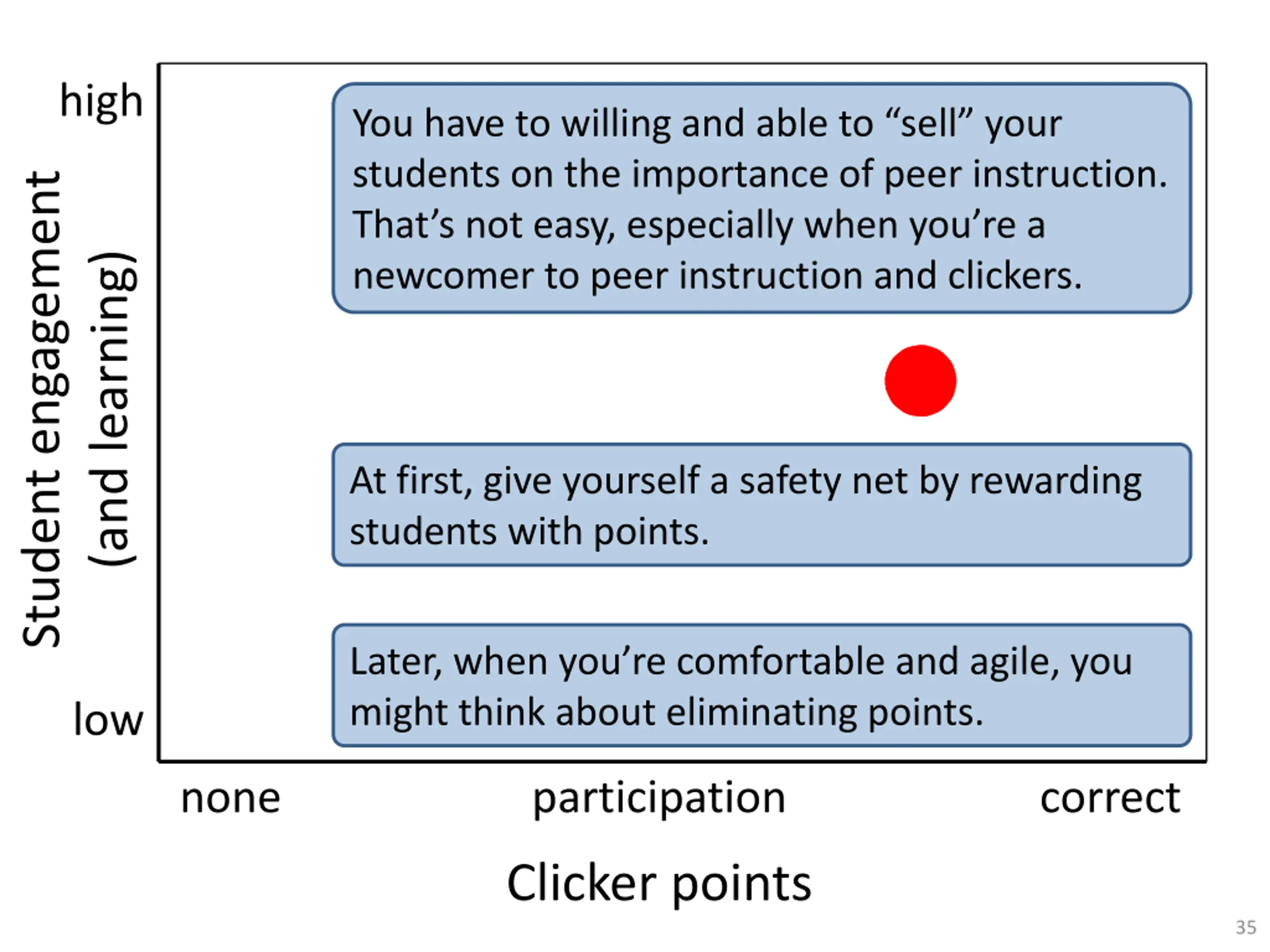 high You have to willing and able to sell your students on the importance of peer instruction. That s not easy, especially when you re a newcomer to peer instruction and clickers. Student engagement (and learning) At first, give yourself a safety net by rewarding students with points. Later, when you re comfortable and agile, you might think about eliminating points. low none participation correct Clicker points 35