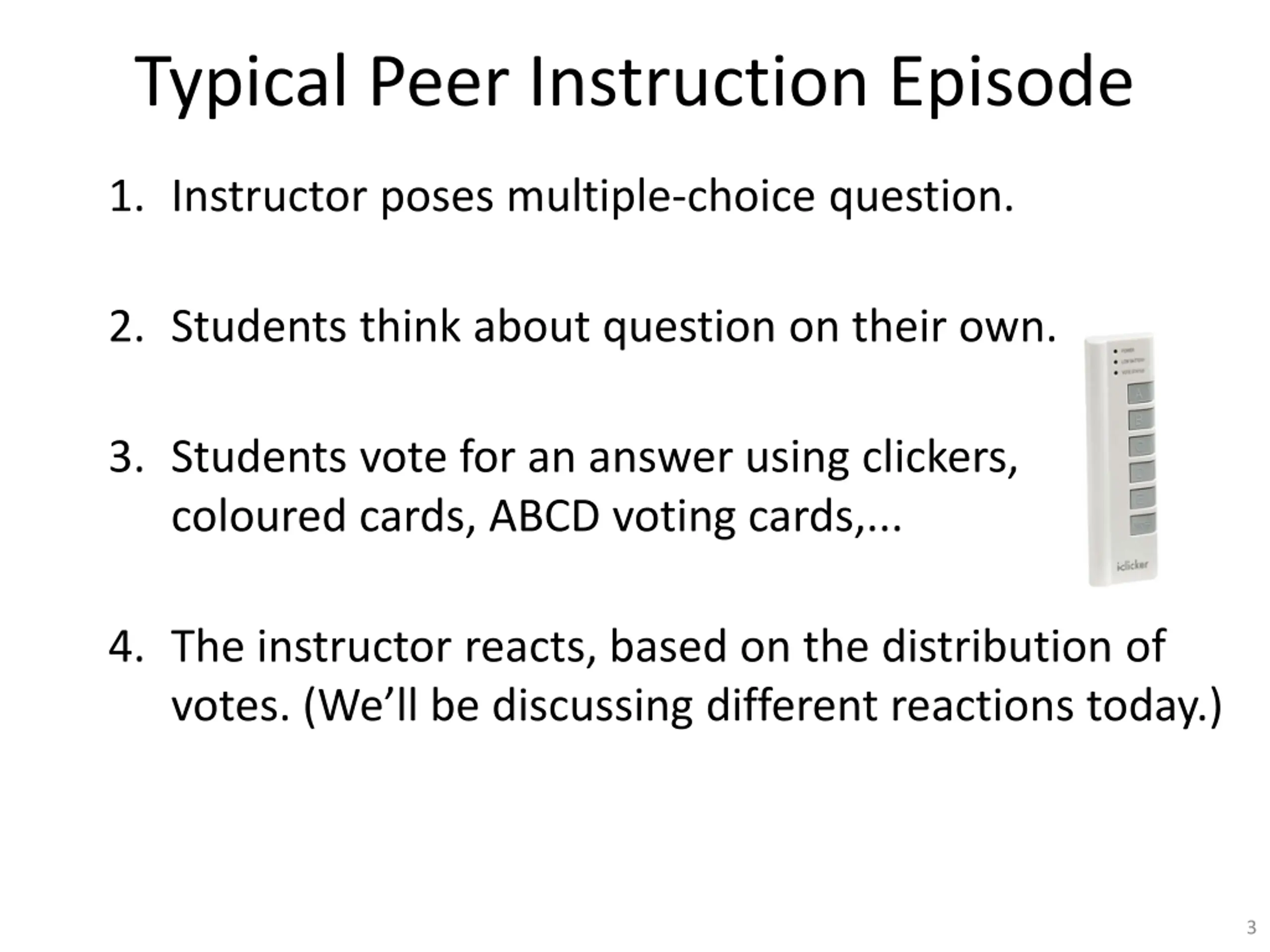Typical Peer Instruction Episode 1. Instructor poses multiple-choice question. 2. Students think about question on their own. 3. Students vote for an answer using clickers, coloured cards, ABCD voting cards,... 4. The instructor reacts, based on the distribution of votes. (We ll be discussing different reactions today.) 3