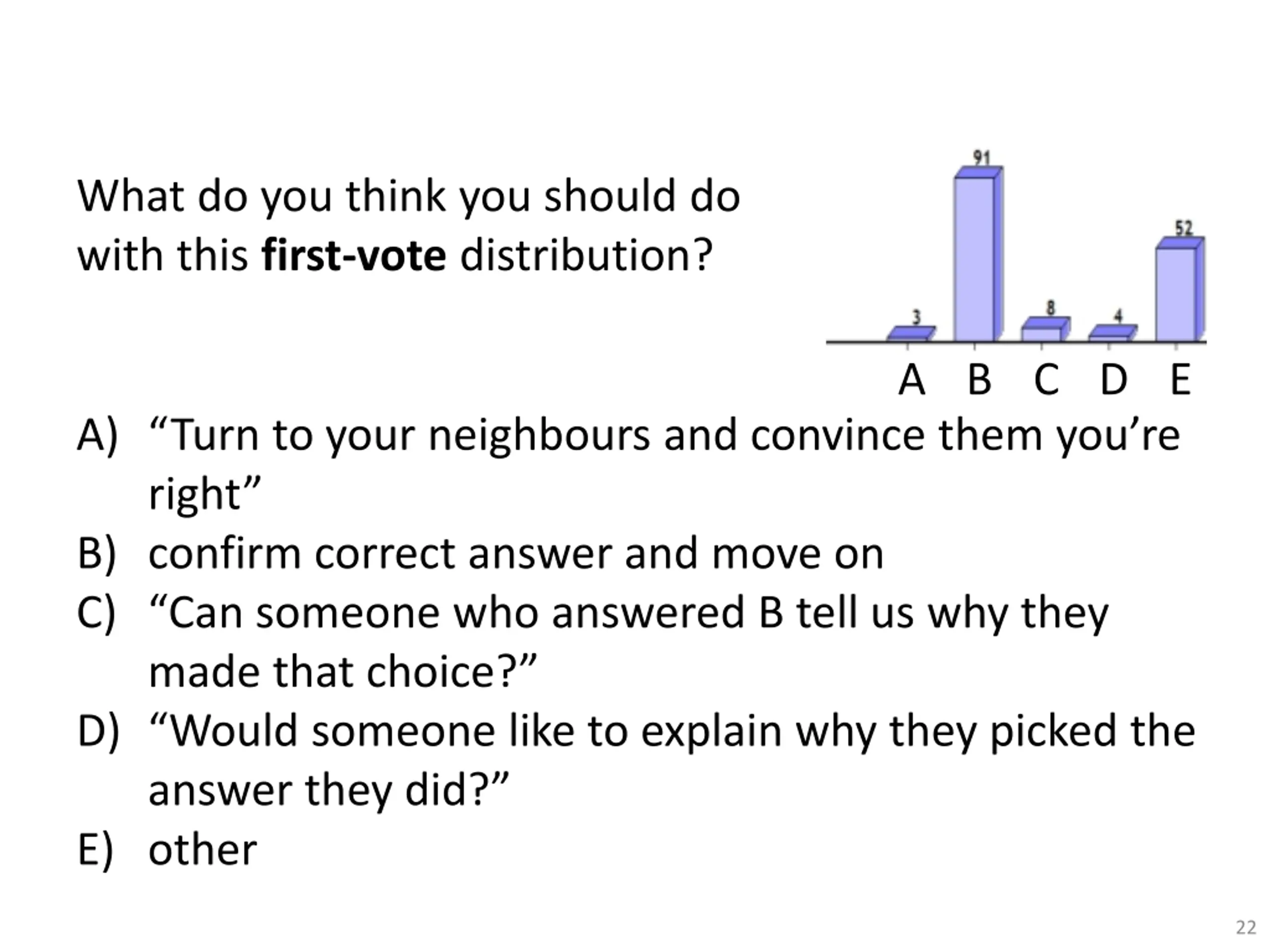 What do you think you should do with this first-vote distribution? A B C D E A) Turn to your neighbours and convince them you re right B) confirm correct answer and move on C) Can someone who answered B tell us why they made that choice? D) Would someone like to explain why they picked the answer they did? E) other 22
