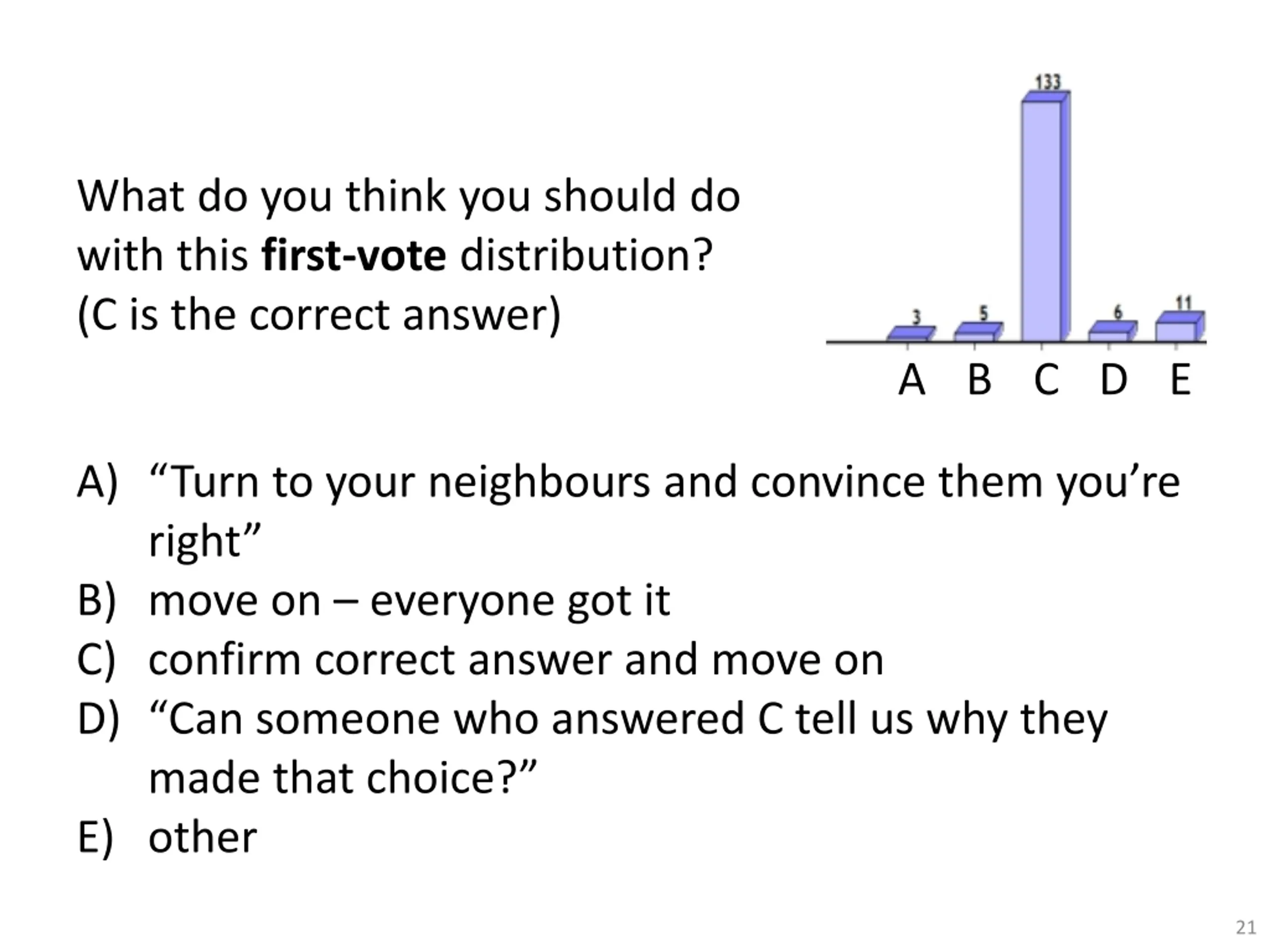 What do you think you should do with this first-vote distribution? (C is the correct answer) A B C D E A) Turn to your neighbours and convince them you re right B) move on everyone got it C) confirm correct answer and move on D) Can someone who answered C tell us why they made that choice? E) other 21