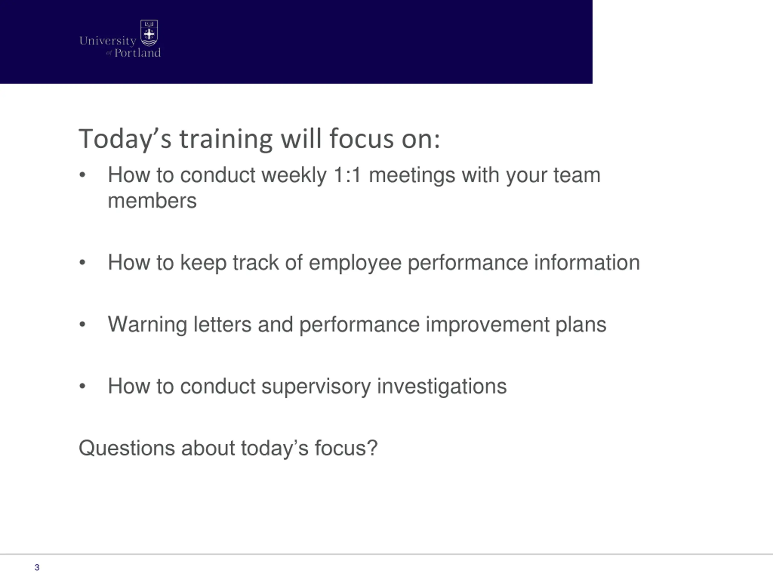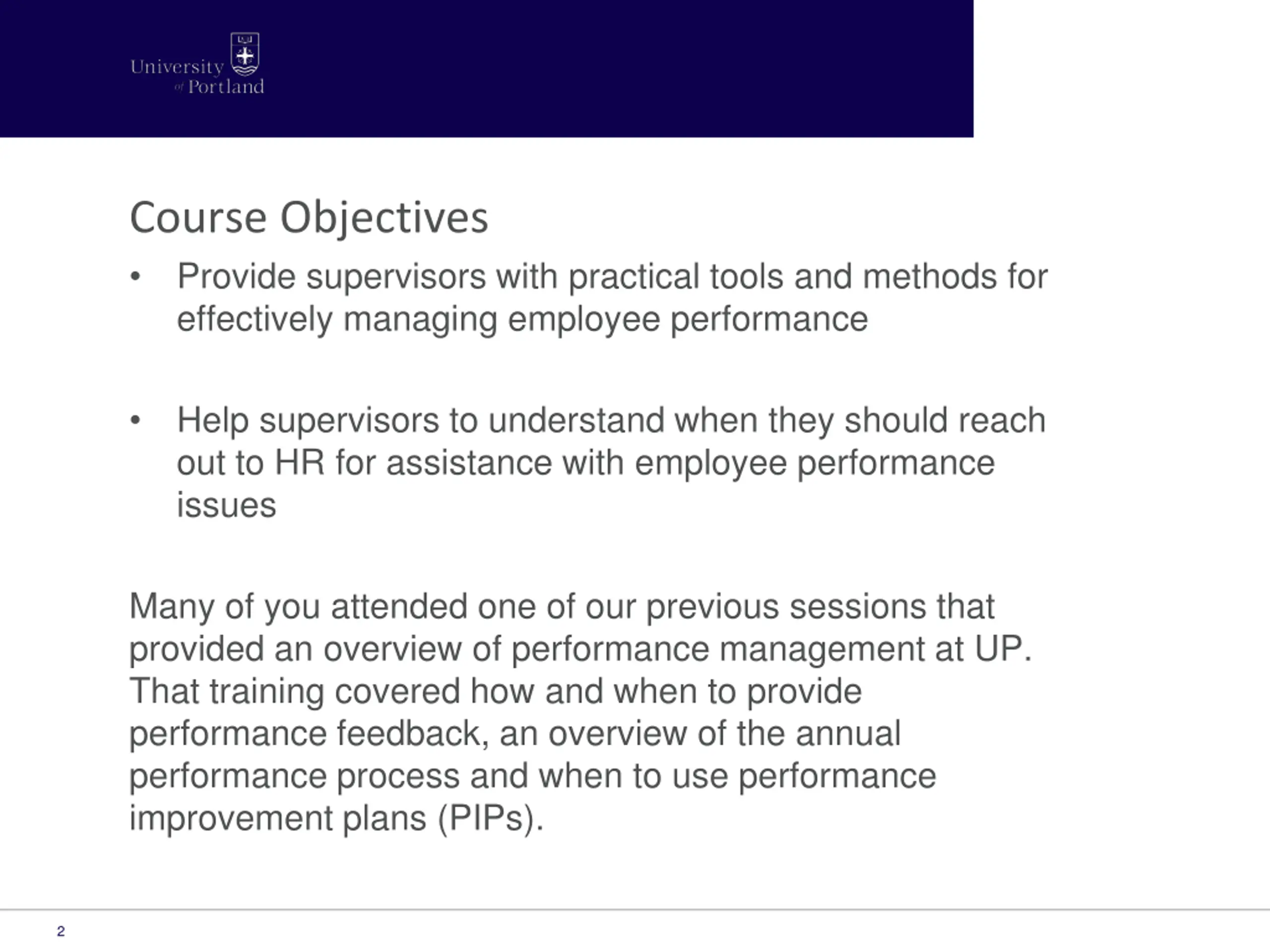 Course Objectives Provide supervisors with practical tools and methods for effectively managing employee performance Help supervisors to understand when they should reach out to HR for assistance with employee performance issues Many of you attended one of our previous sessions that provided an overview of performance management at UP. That training covered how and when to provide performance feedback, an overview of the annual performance process and when to use performance improvement plans (PIPs). 2