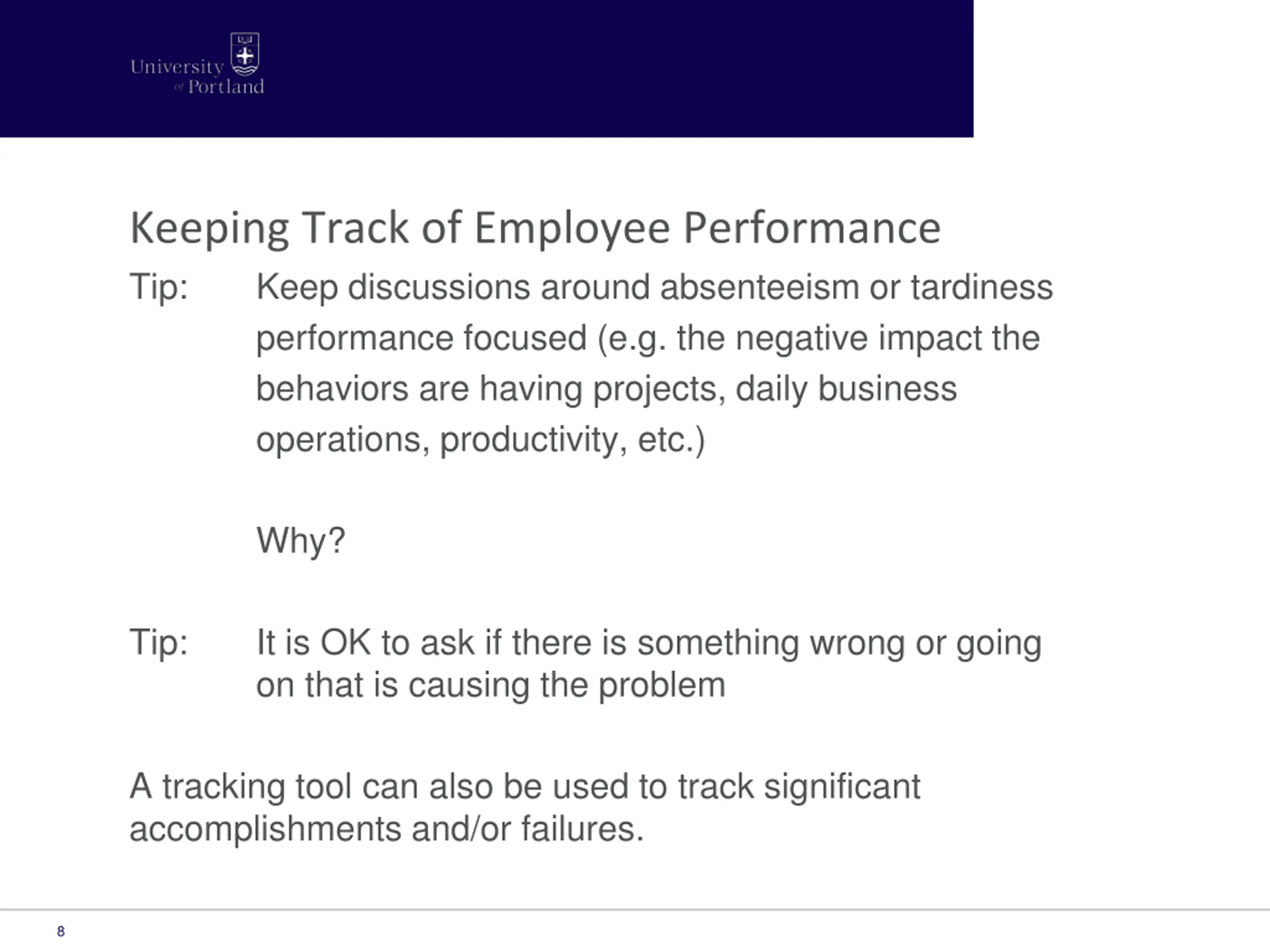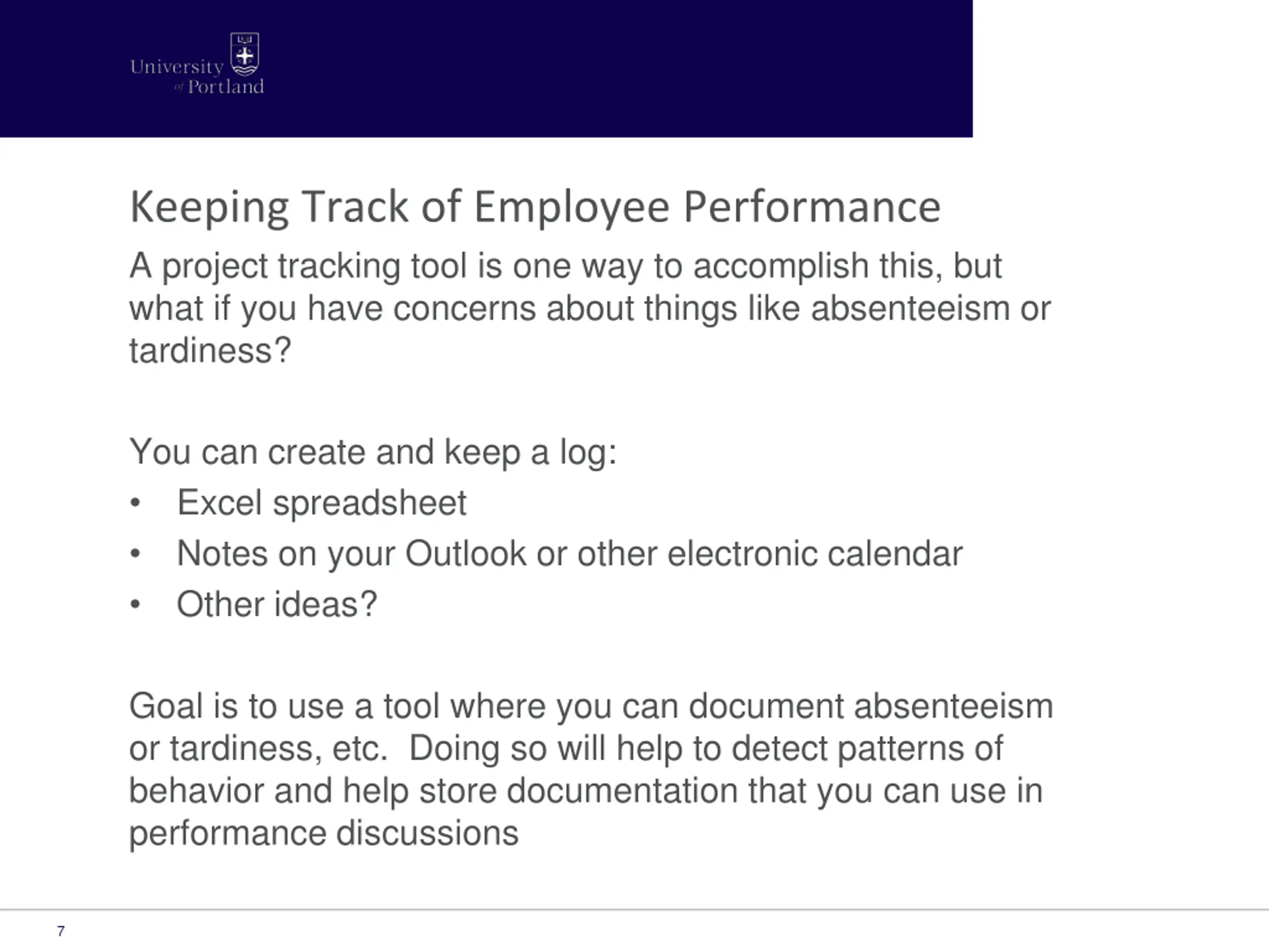 Keeping Track of Employee Performance A project tracking tool is one way to accomplish this, but what if you have concerns about things like absenteeism or tardiness? You can create and keep a log: Excel spreadsheet Notes on your Outlook or other electronic calendar Other ideas? Goal is to use a tool where you can document absenteeism or tardiness, etc. Doing so will help to detect patterns of behavior and help store documentation that you can use in performance discussions 7