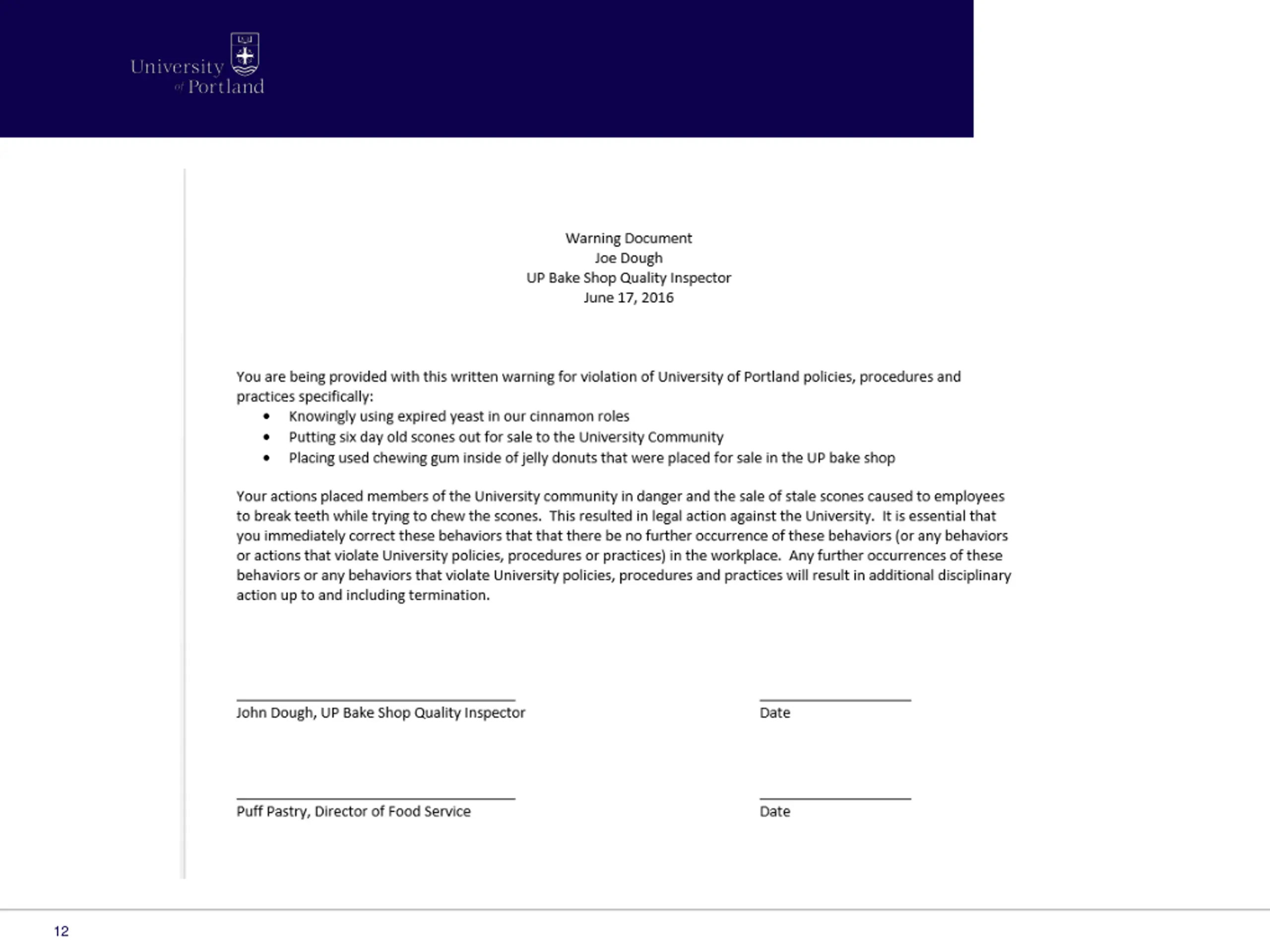 Warning Letters and PIPs Written Warnings Generally issued after informal counseling or verbal warnings do not foster improved performance It is not necessary in all cases that a verbal warning precede a written warning Can you think of any situations where this might be the case? Provide a copy to the employee Keep a copy for your files Scan and forward a signed copy to HR 11