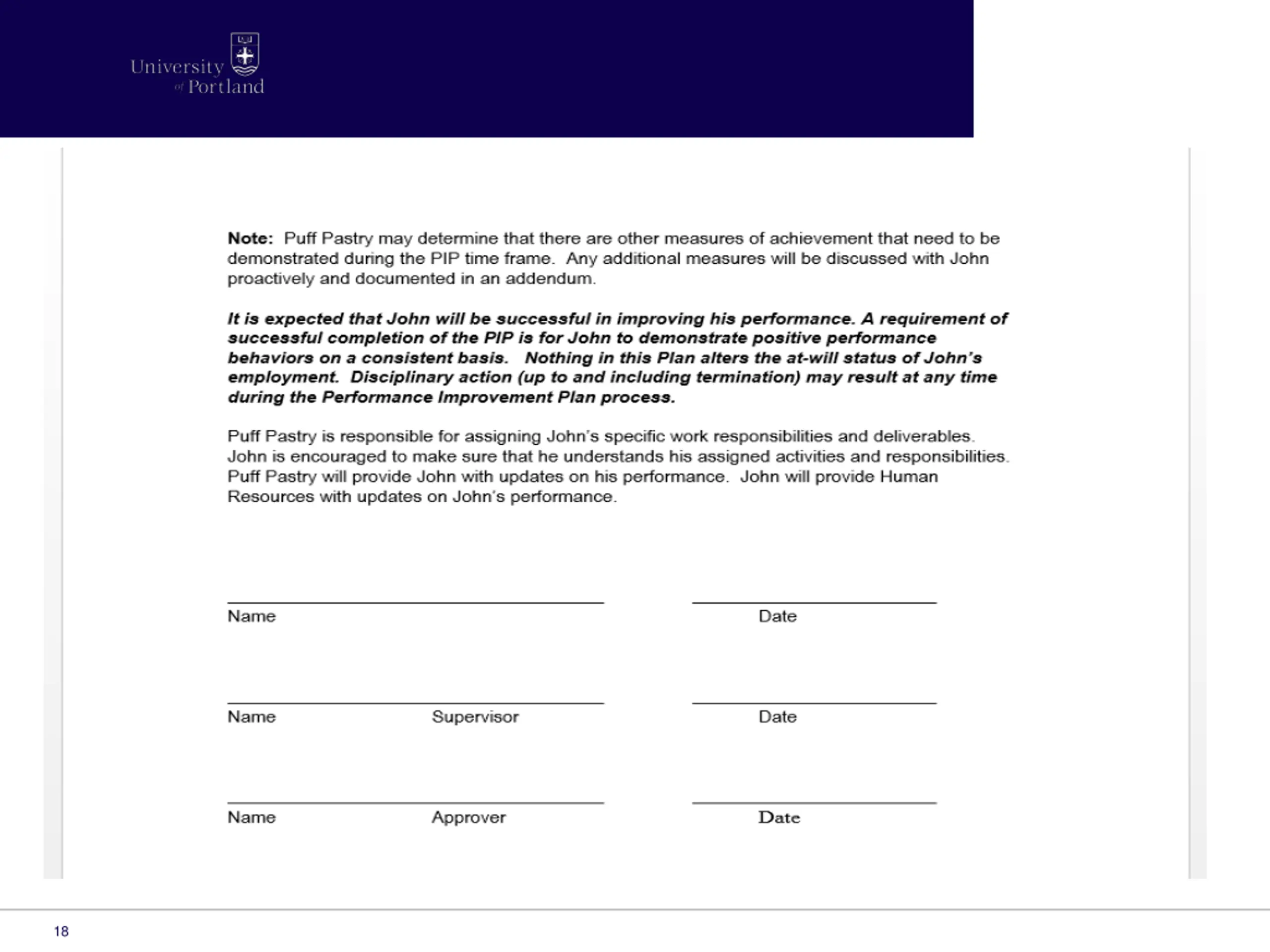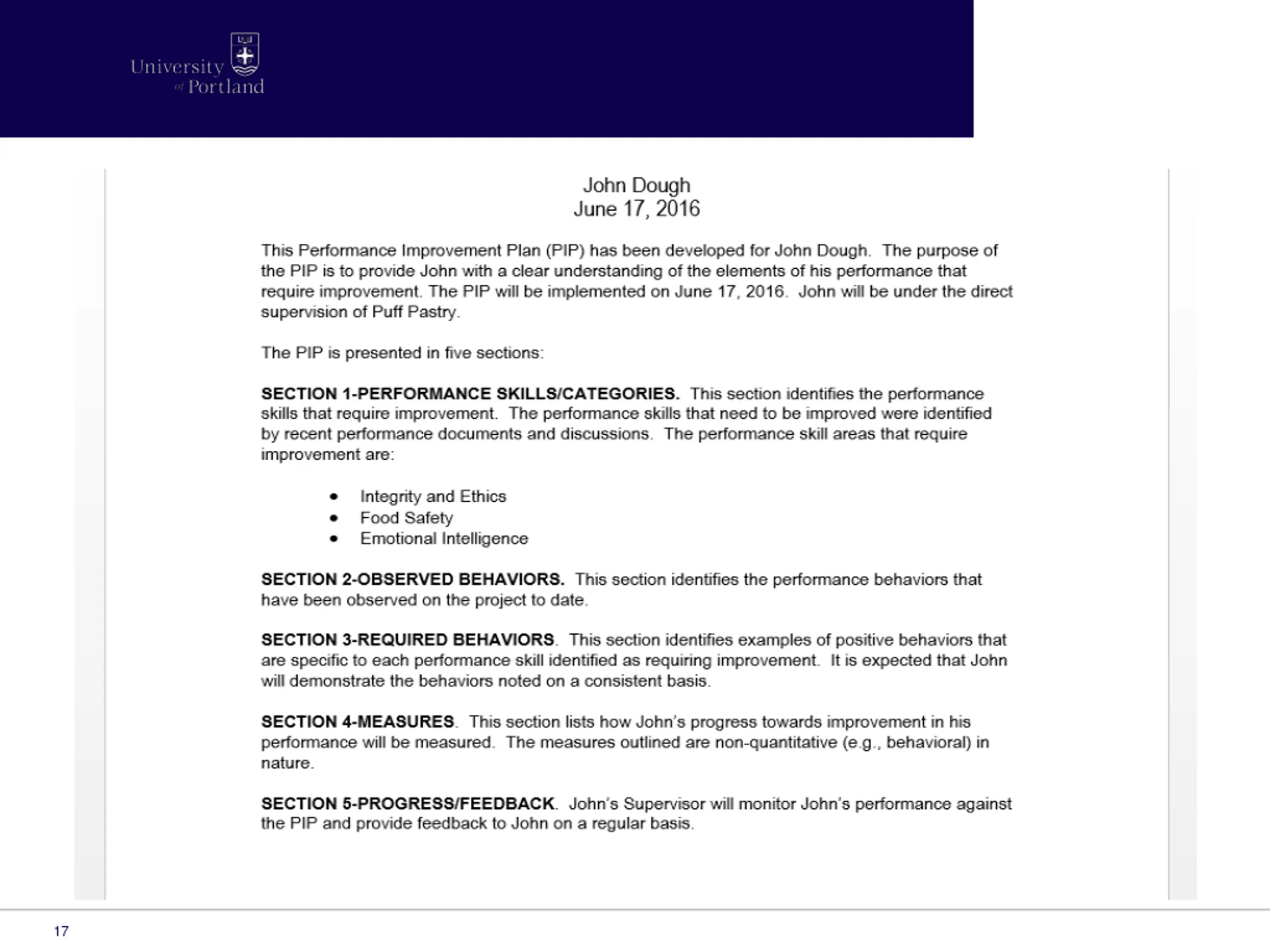 Warning Letters and PIPs Performance Improvement Plans KISS (Keep It Simple, Stupid)* Use job description and position leveling criteria to isolate/identify areas for improvement No more than three areas for improvement in PIP Employee needs to show sustained improvement in areas identified in PIP PIP needs to have an articulated timeframe for improvement and should not be open-ended Manager may choose to: Extend PIP timeframe End PIP early if employee not making necessary progress *E.B. White and William Strunk, The Elements of Style, 1920 16