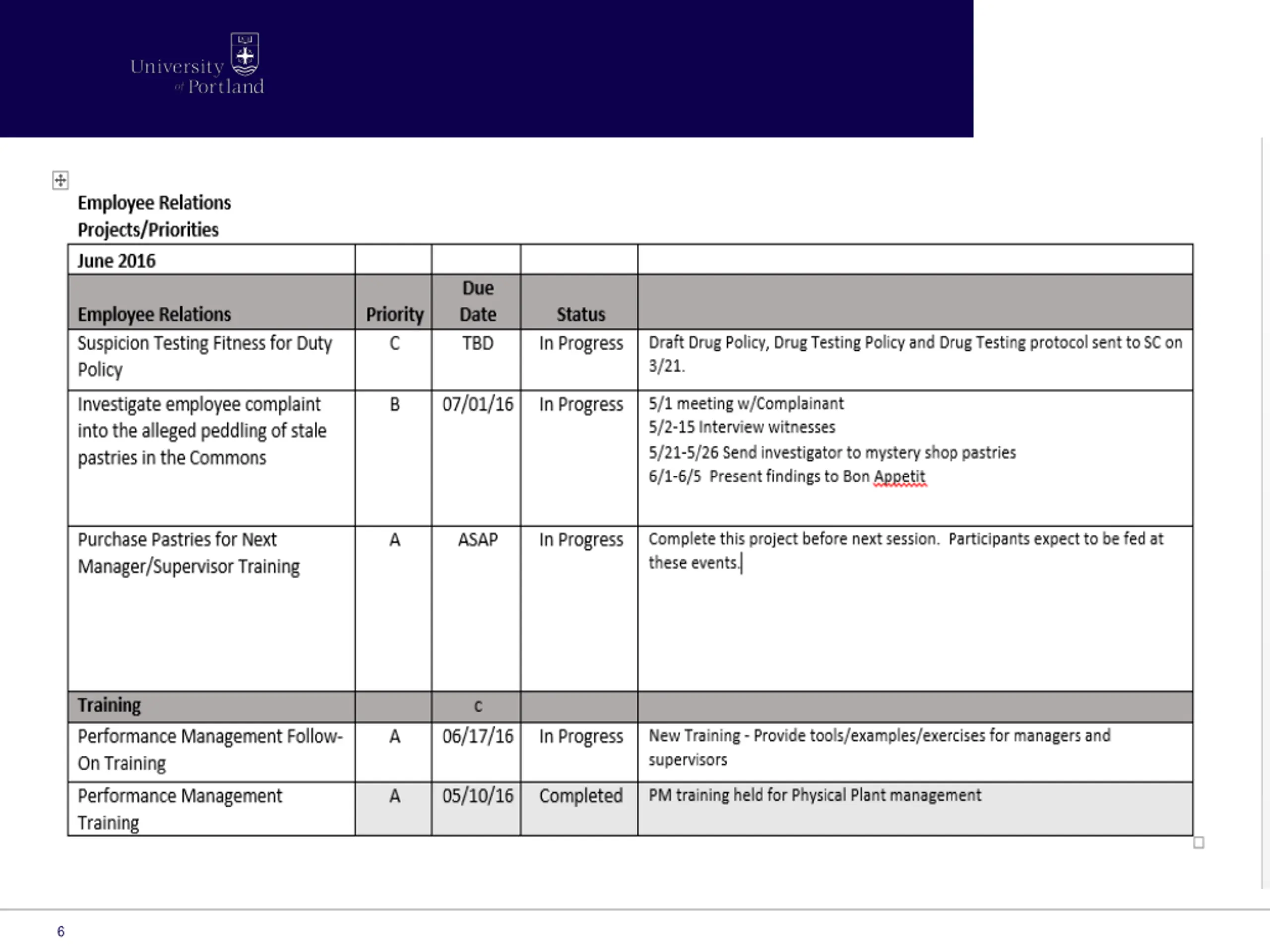 Weekly 1:1 Meetings Tips: Think about what you want from the meetings Decide whether you want to use a fixed agenda (recommended) You may want the employee to create the agenda Tools: Advisable to use some form of project/work tracking tool Have staff person manage tool and bring to each meeting Serves as discussion tool Allows for management and documentation of priorities Can be used to inform performance evaluations 5