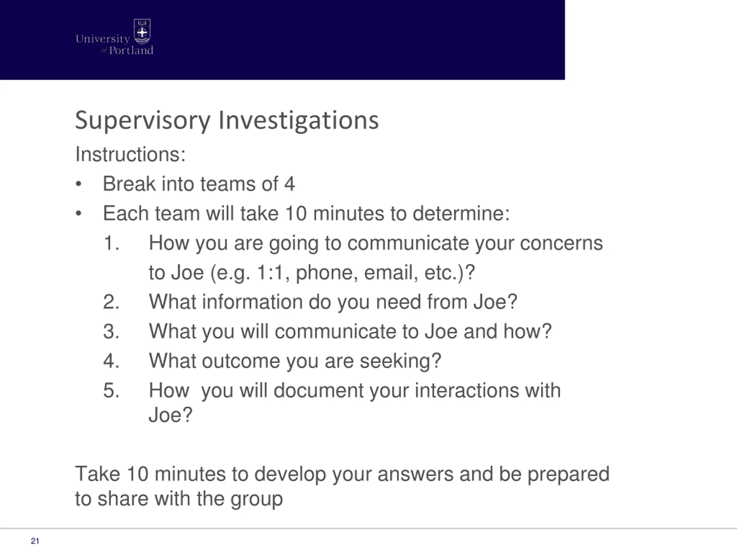 Supervisory Investigations Instructions: Break into teams of 4 Each team will take 10 minutes to determine: 1. How you are going to communicate your concerns to Joe (e.g. 1:1, phone, email, etc.)? 2. What information do you need from Joe? 3. What you will communicate to Joe and how? 4. What outcome you are seeking? 5. How you will document your interactions with Joe? Take 10 minutes to develop your answers and be prepared to share with the group 21