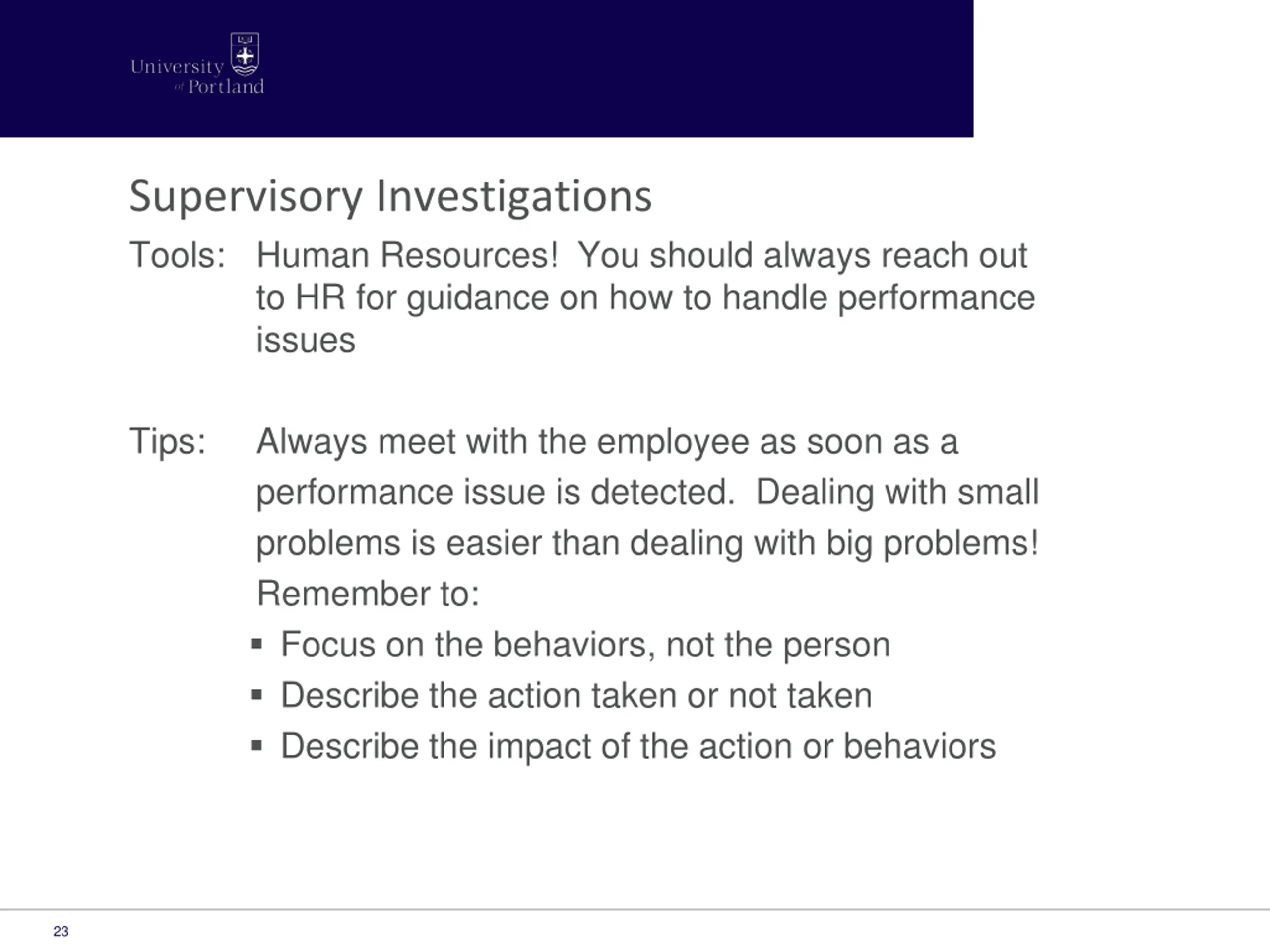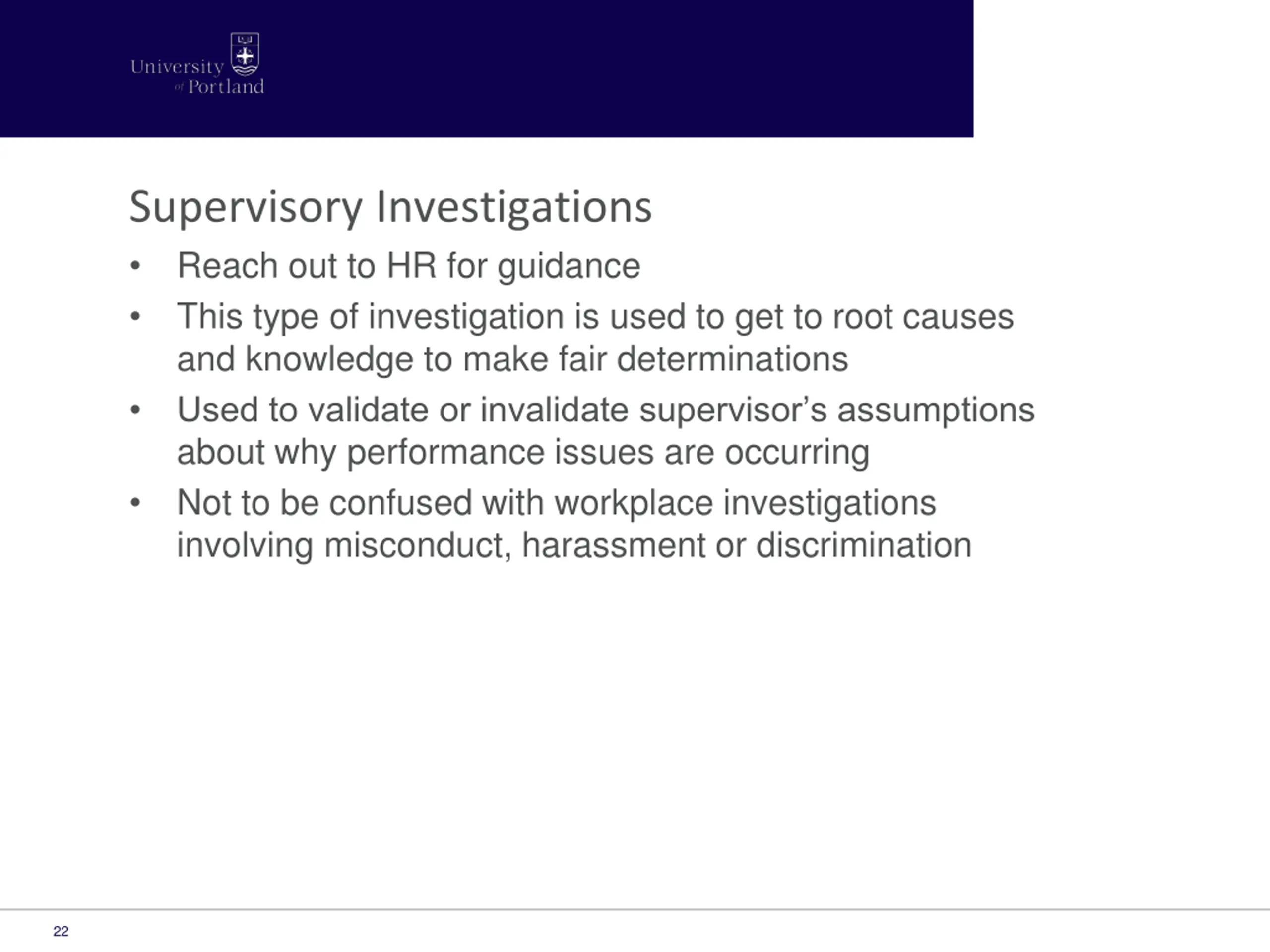 Supervisory Investigations Reach out to HR for guidance This type of investigation is used to get to root causes and knowledge to make fair determinations Used to validate or invalidate supervisor s assumptions about why performance issues are occurring Not to be confused with workplace investigations involving misconduct, harassment or discrimination 22