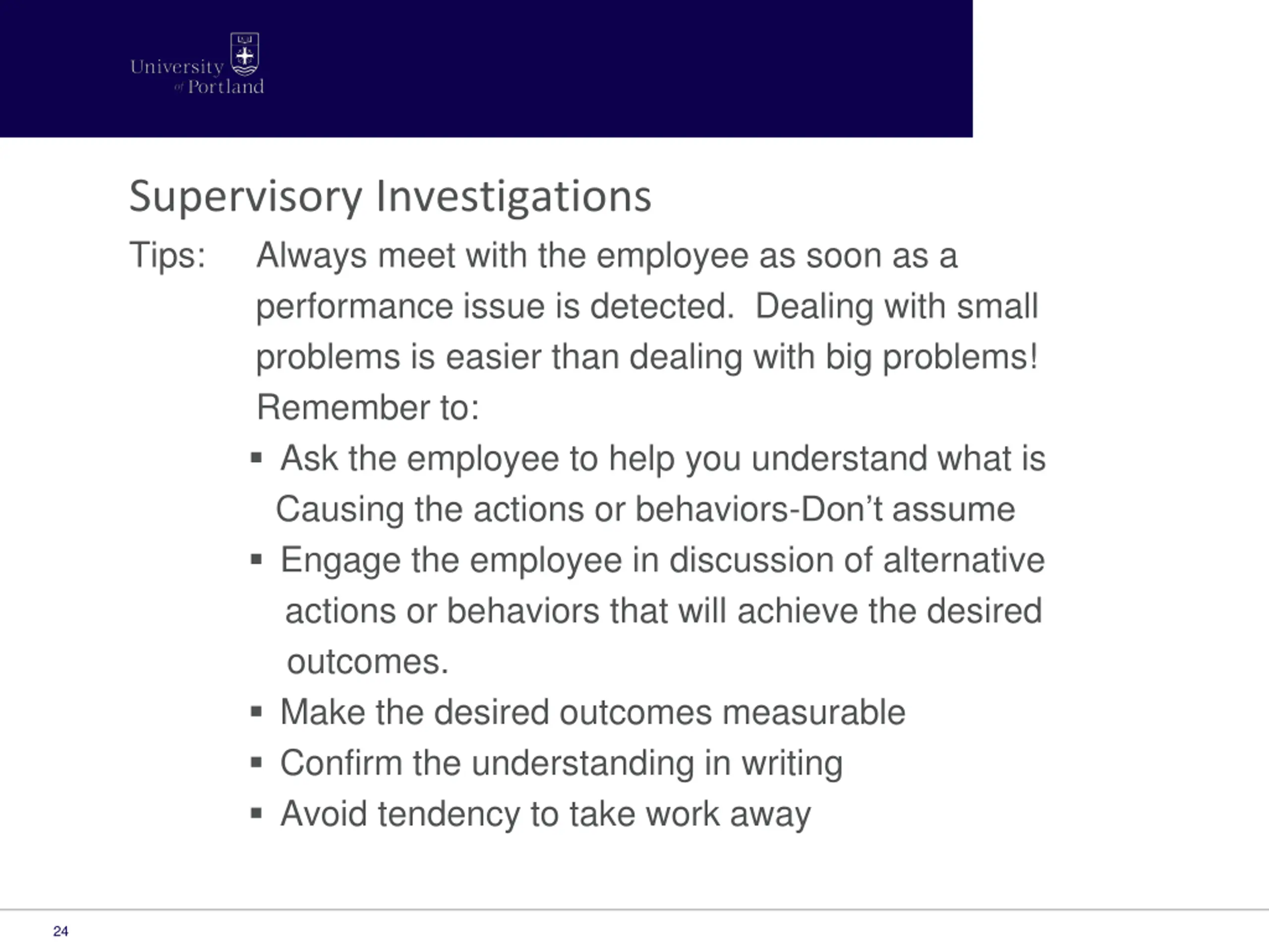 Supervisory Investigations Tools: Human Resources! You should always reach out to HR for guidance on how to handle performance issues Tips: Always meet with the employee as soon as a performance issue is detected. Dealing with small problems is easier than dealing with big problems! Remember to: Focus on the behaviors, not the person Describe the action taken or not taken Describe the impact of the action or behaviors 23