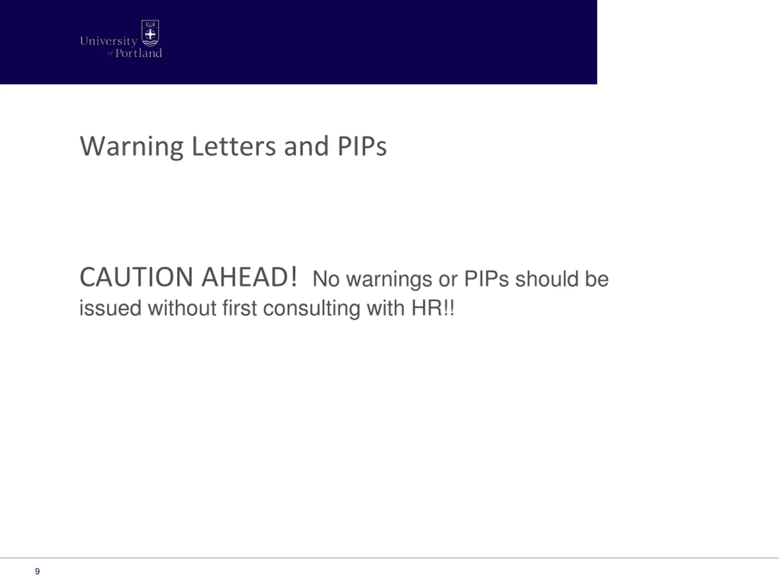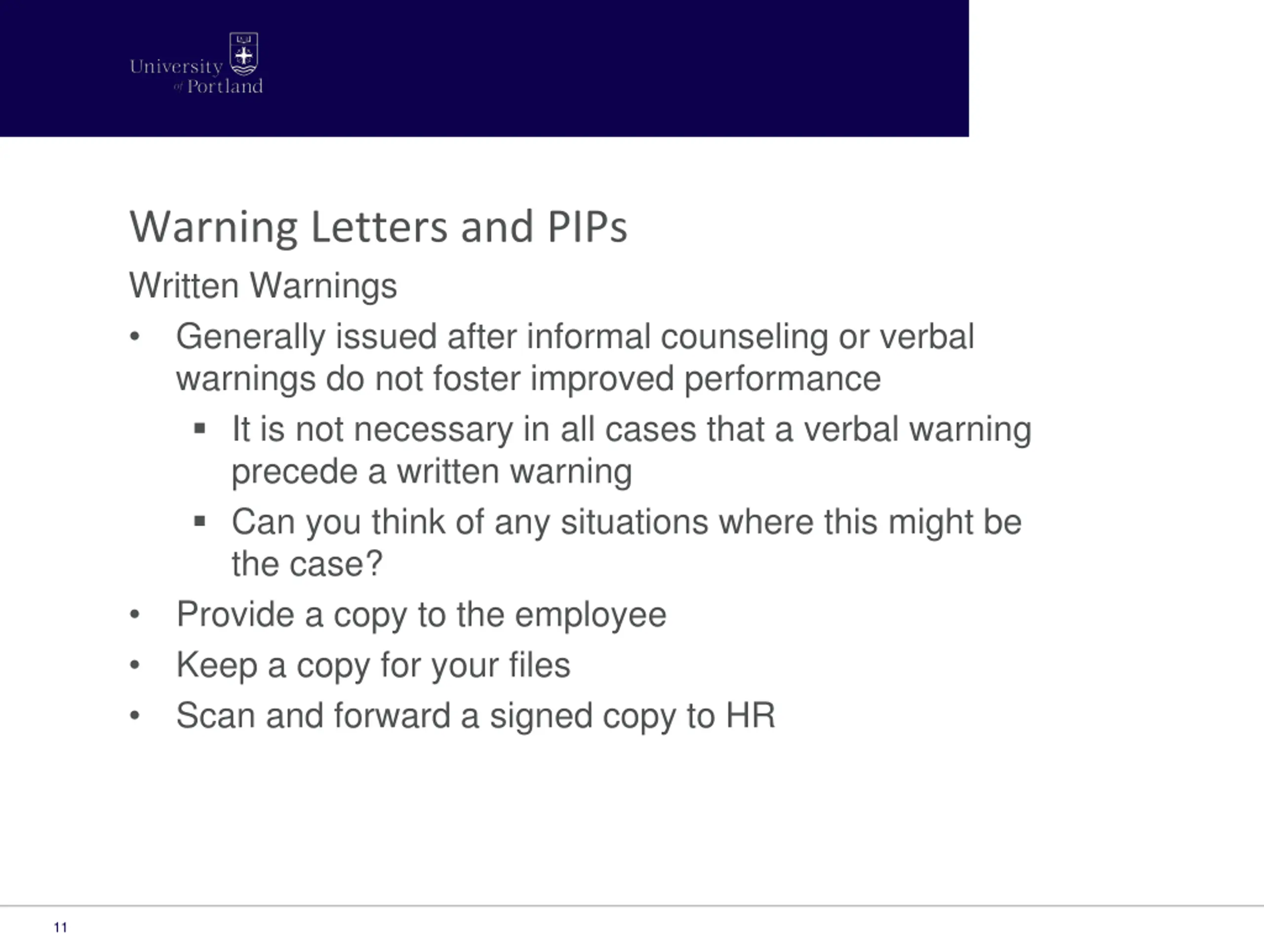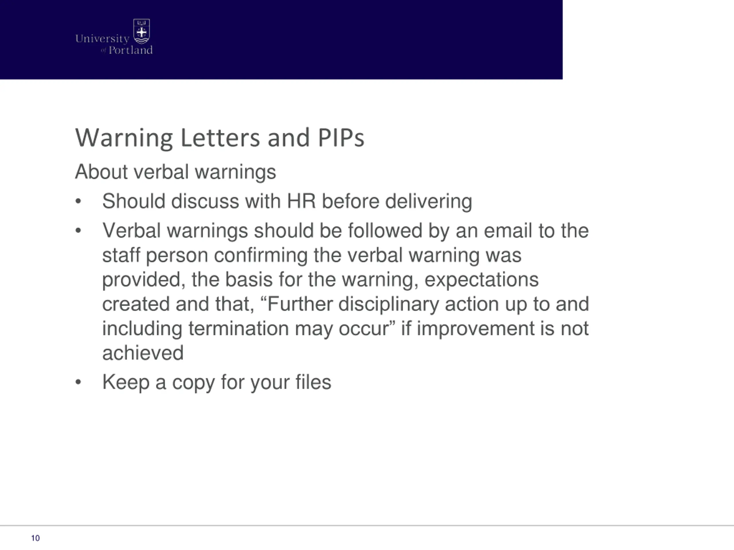 Warning Letters and PIPs About verbal warnings Should discuss with HR before delivering Verbal warnings should be followed by an email to the staff person confirming the verbal warning was provided, the basis for the warning, expectations created and that, Further disciplinary action up to and including termination may occur if improvement is not achieved Keep a copy for your files 10