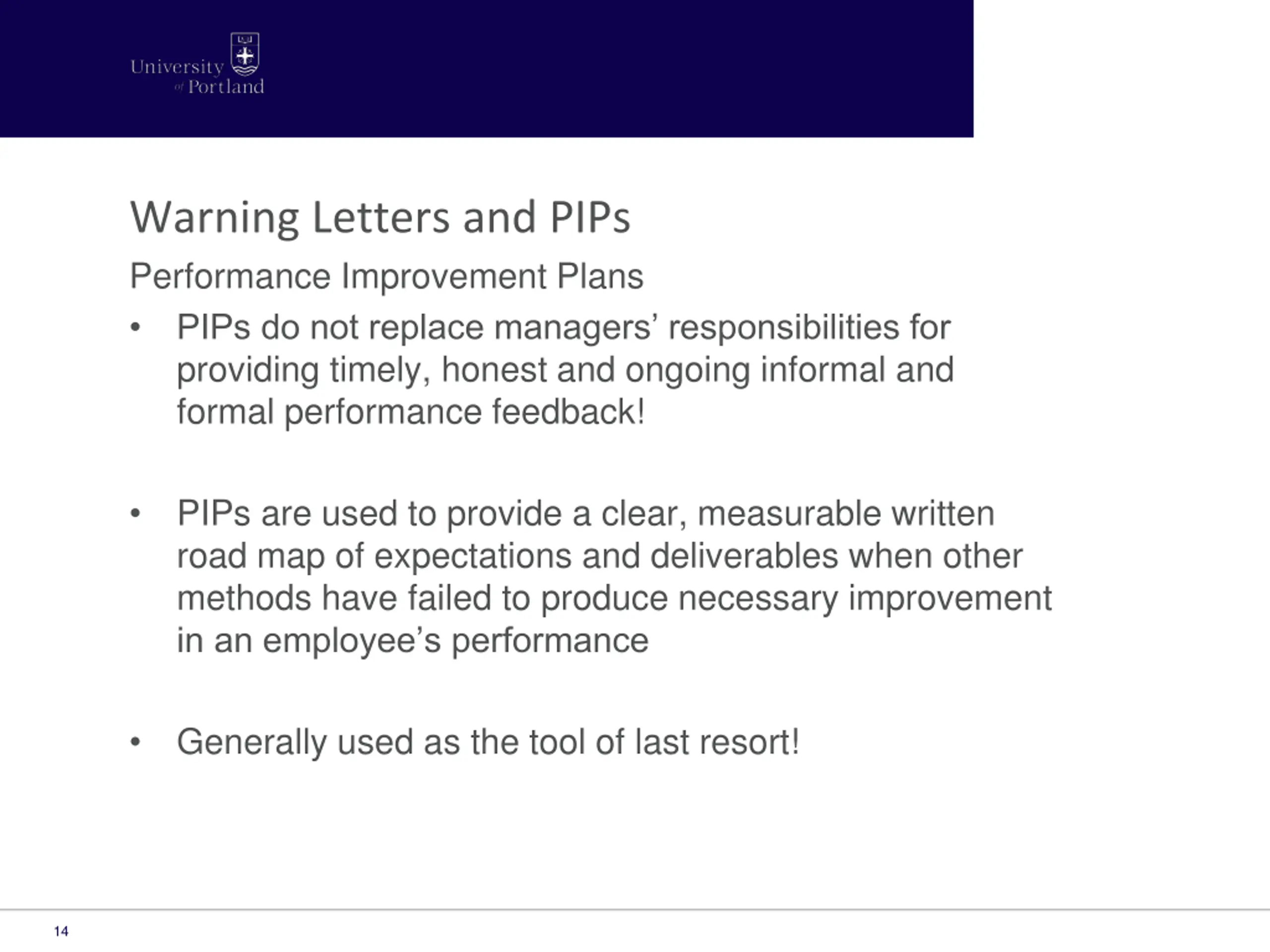 Warning Letters and PIPs Performance Improvement Plans PIPs do not replace managers responsibilities for providing timely, honest and ongoing informal and formal performance feedback! PIPs are used to provide a clear, measurable written road map of expectations and deliverables when other methods have failed to produce necessary improvement in an employee s performance Generally used as the tool of last resort! 13