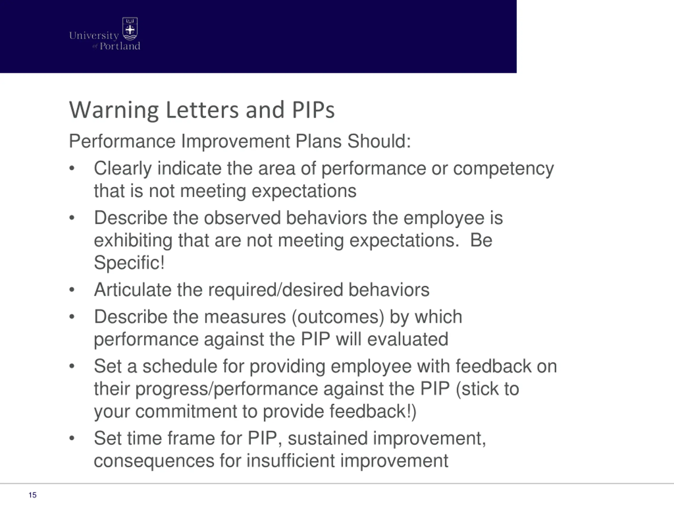 Warning Letters and PIPs Performance Improvement Plans PIPs do not replace managers responsibilities for providing timely, honest and ongoing informal and formal performance feedback! PIPs are used to provide a clear, measurable written road map of expectations and deliverables when other methods have failed to produce necessary improvement in an employee s performance Generally used as the tool of last resort! 14