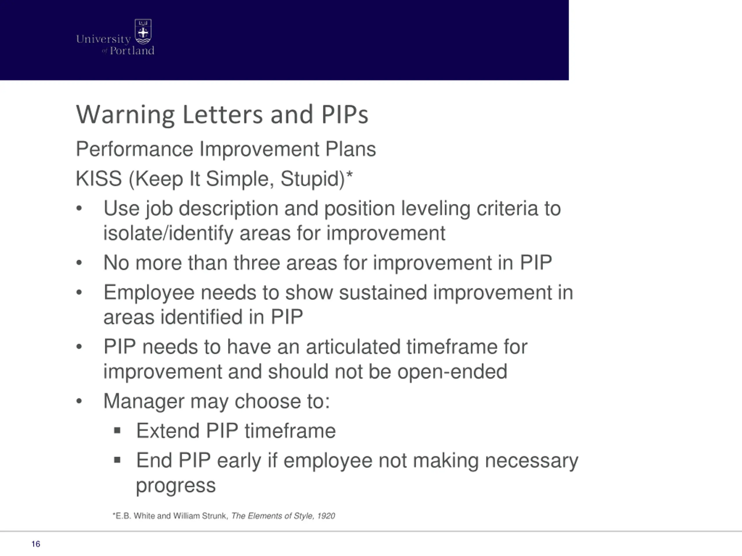 Warning Letters and PIPs Performance Improvement Plans Should: Clearly indicate the area of performance or competency that is not meeting expectations Describe the observed behaviors the employee is exhibiting that are not meeting expectations. Be Specific! Articulate the required/desired behaviors Describe the measures (outcomes) by which performance against the PIP will evaluated Set a schedule for providing employee with feedback on their progress/performance against the PIP (stick to your commitment to provide feedback!) Set time frame for PIP, sustained improvement, consequences for insufficient improvement 15