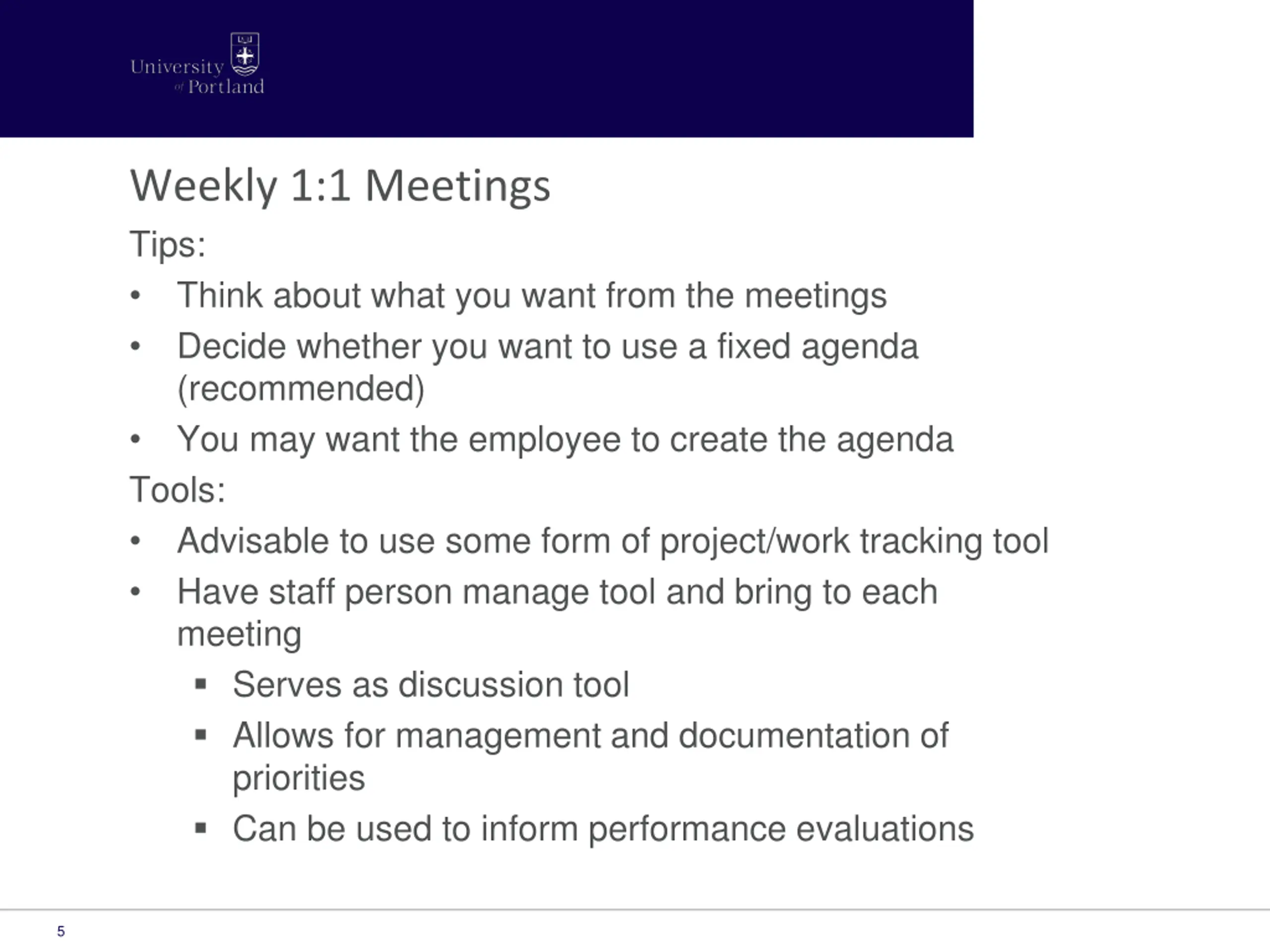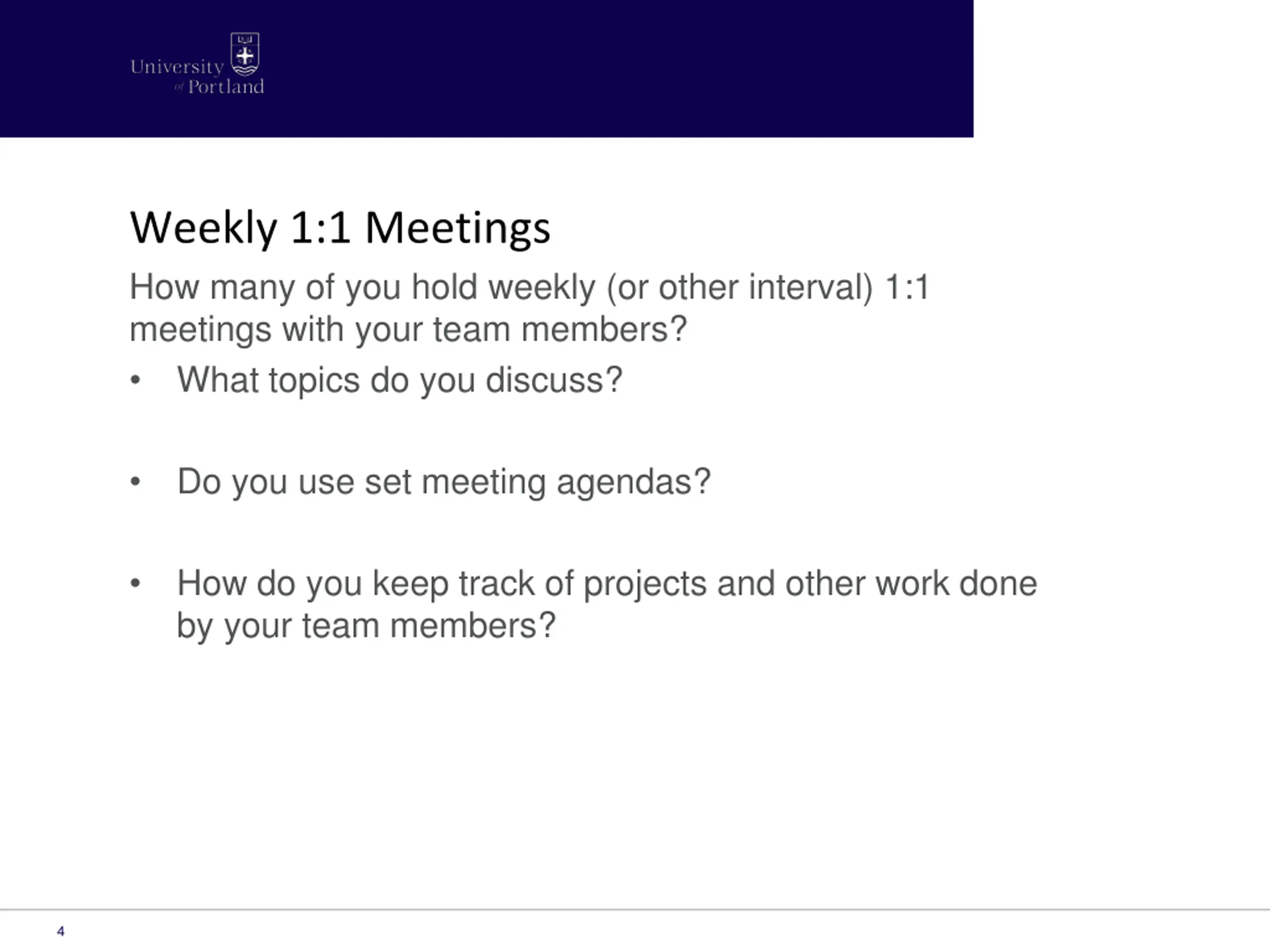 Weekly 1:1 Meetings How many of you hold weekly (or other interval) 1:1 meetings with your team members? What topics do you discuss? Do you use set meeting agendas? How do you keep track of projects and other work done by your team members? 4
