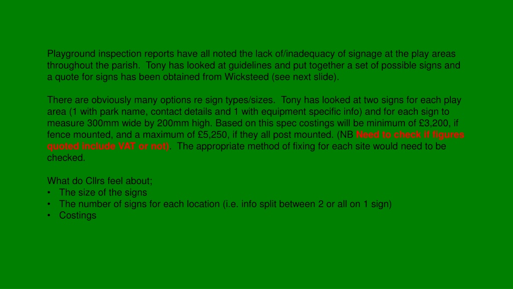 Playground inspection reports have all noted the lack of/inadequacy of signage at the play areas throughout the parish. Tony has looked at guidelines and put together a set of possible signs and a quote for signs has been obtained from Wicksteed (see next slide). There are obviously many options re sign types/sizes. Tony has looked at two signs for each play area (1 with park name, contact details and 1 with equipment specific info) and for each sign to measure 300mm wide by 200mm high. Based on this spec costings will be minimum of 3,200, if fence mounted, and a maximum of 5,250, if they all post mounted. (NB Need to check if figures quoted include VAT or not). The appropriate method of fixing for each site would need to be checked. What do Cllrs feel about; The size of the signs The number of signs for each location (i.e. info split between 2 or all on 1 sign) Costings