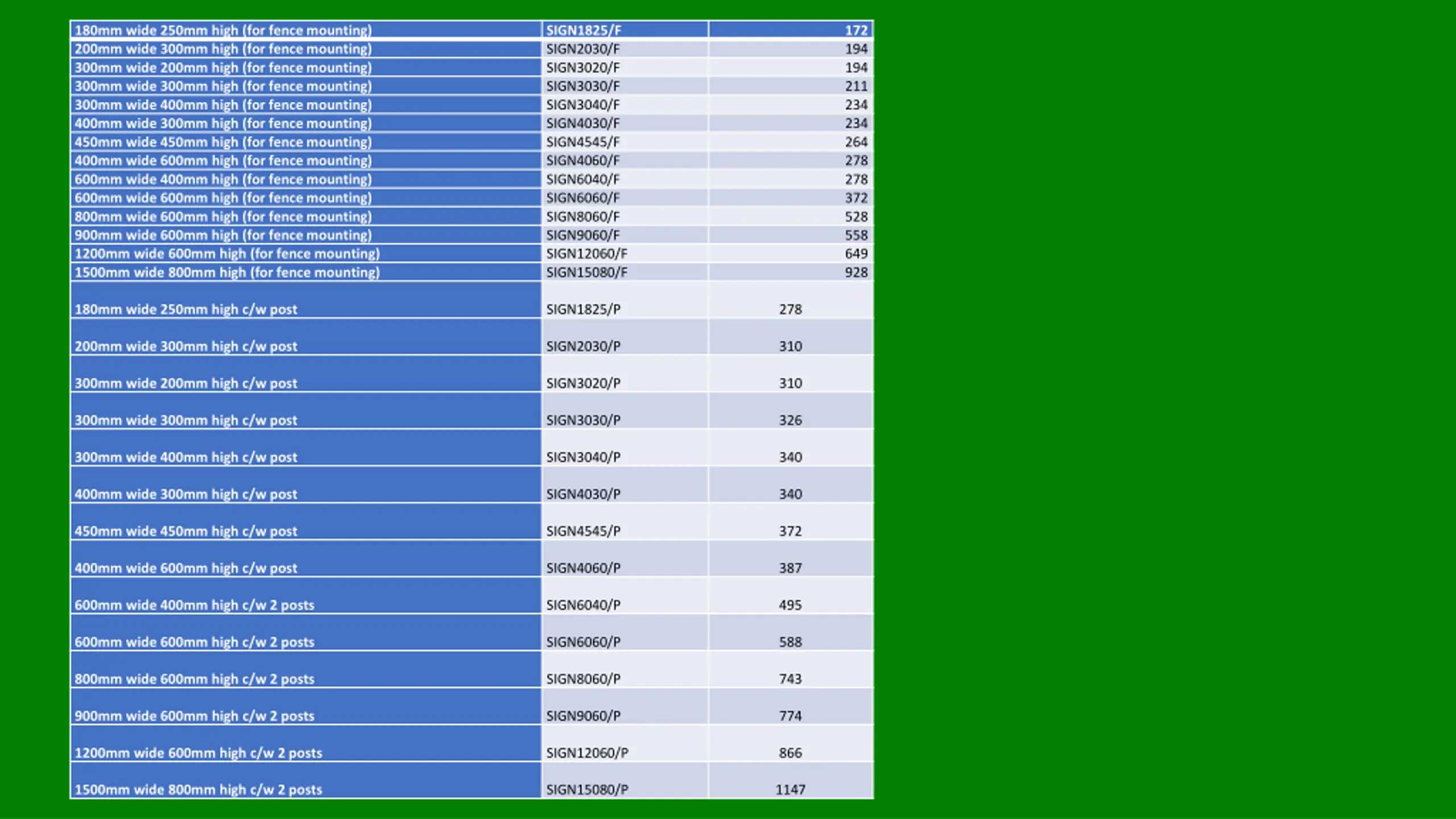 180mm wide 250mm high (for fence mounting) 200mm wide 300mm high (for fence mounting) 300mm wide 200mm high (for fence mounting) 300mm wide 300mm high (for fence mounting) 300mm wide 400mm high (for fence mounting) 400mm wide 300mm high (for fence mounting) 450mm wide 450mm high (for fence mounting) 400mm wide 600mm high (for fence mounting) 600mm wide 400mm high (for fence mounting) 600mm wide 600mm high (for fence mounting) 800mm wide 600mm high (for fence mounting) 900mm wide 600mm high (for fence mounting) 1200mm wide 600mm high (for fence mounting) 1500mm wide 800mm high (for fence mounting) SIGN1825/F SIGN2030/F SIGN3020/F SIGN3030/F SIGN3040/F SIGN4030/F SIGN4545/F SIGN4060/F SIGN6040/F SIGN6060/F SIGN8060/F SIGN9060/F SIGN12060/F SIGN15080/F 172 194 194 211 234 234 264 278 278 372 528 558 649 928 180mm wide 250mm high c/w post SIGN1825/P 278 200mm wide 300mm high c/w post SIGN2030/P 310 300mm wide 200mm high c/w post SIGN3020/P 310 300mm wide 300mm high c/w post SIGN3030/P 326 300mm wide 400mm high c/w post SIGN3040/P 340 400mm wide 300mm high c/w post SIGN4030/P 340 450mm wide 450mm high c/w post SIGN4545/P 372 400mm wide 600mm high c/w post SIGN4060/P 387 600mm wide 400mm high c/w 2 posts SIGN6040/P 495 600mm wide 600mm high c/w 2 posts SIGN6060/P 588 800mm wide 600mm high c/w 2 posts SIGN8060/P 743 900mm wide 600mm high c/w 2 posts SIGN9060/P 774 1200mm wide 600mm high c/w 2 posts SIGN12060/P 866 1500mm wide 800mm high c/w 2 posts SIGN15080/P 1147