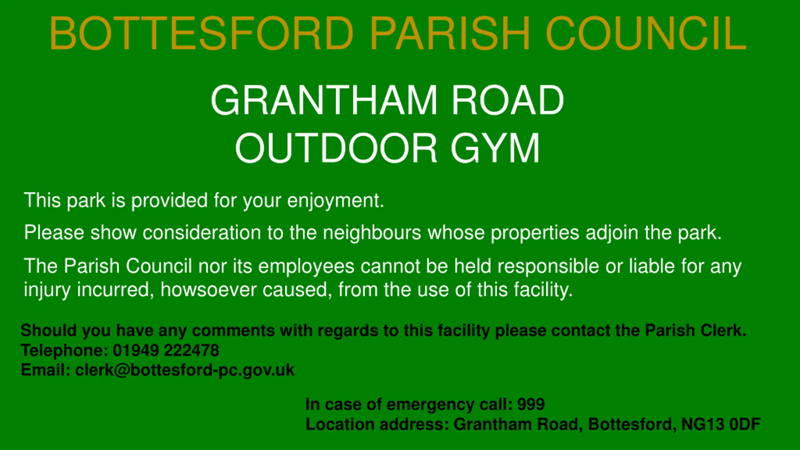 BOTTESFORD PARISH COUNCIL GRANTHAM ROAD OUTDOOR GYM This park is provided for your enjoyment. Please show consideration to the neighbours whose properties adjoin the park. The Parish Council nor its employees cannot be held responsible or liable for any injury incurred, howsoever caused, from the use of this facility. Should you have any comments with regards to this facility please contact the Parish Clerk. Telephone: 01949 222478 Email: clerk@bottesford-pc.gov.uk In case of emergency call: 999 Location address: Grantham Road, Bottesford, NG13 0DF