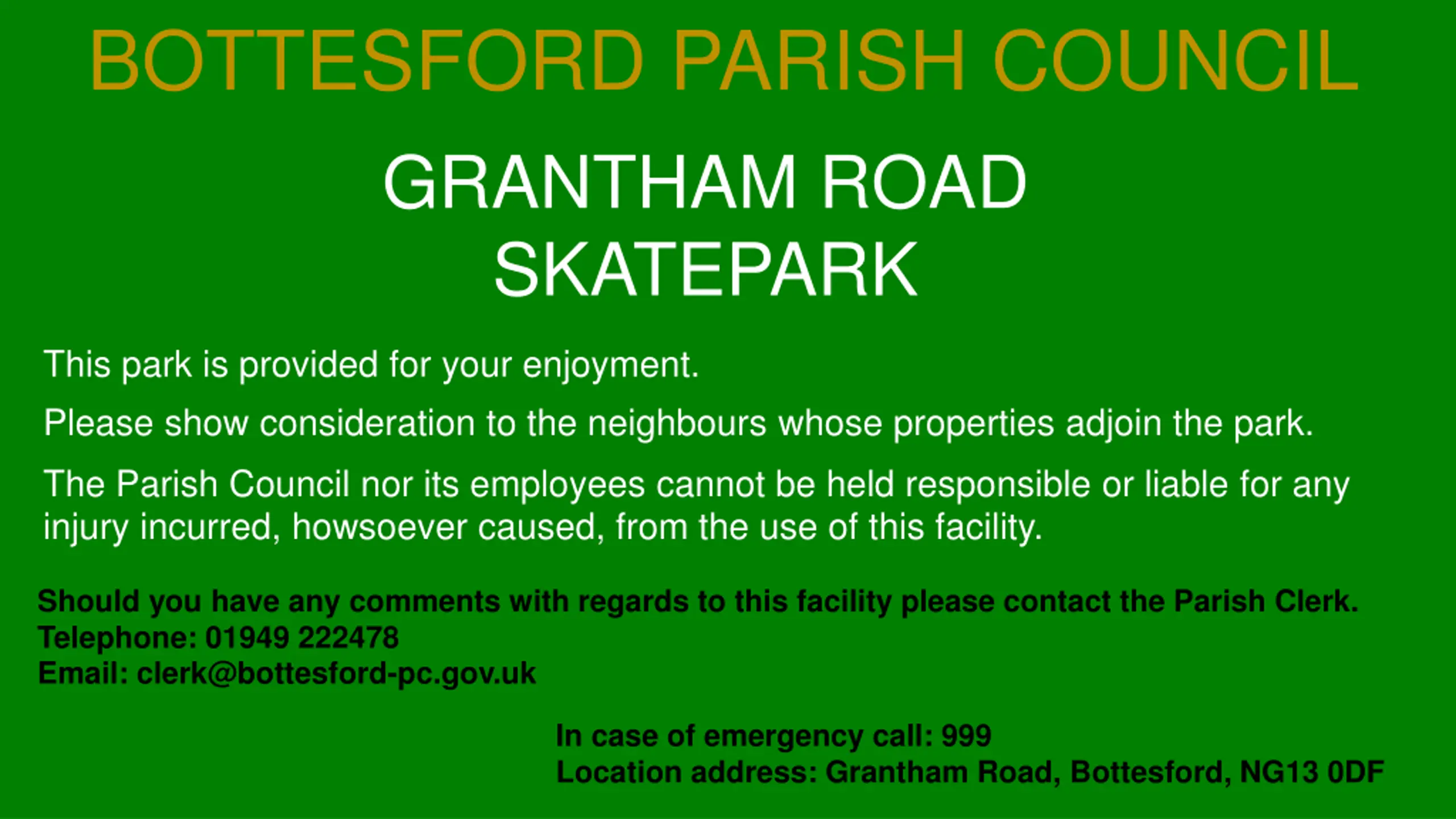 BOTTESFORD PARISH COUNCIL GRANTHAM ROAD SKATEPARK This park is provided for your enjoyment. Please show consideration to the neighbours whose properties adjoin the park. The Parish Council nor its employees cannot be held responsible or liable for any injury incurred, howsoever caused, from the use of this facility. Should you have any comments with regards to this facility please contact the Parish Clerk. Telephone: 01949 222478 Email: clerk@bottesford-pc.gov.uk In case of emergency call: 999 Location address: Grantham Road, Bottesford, NG13 0DF