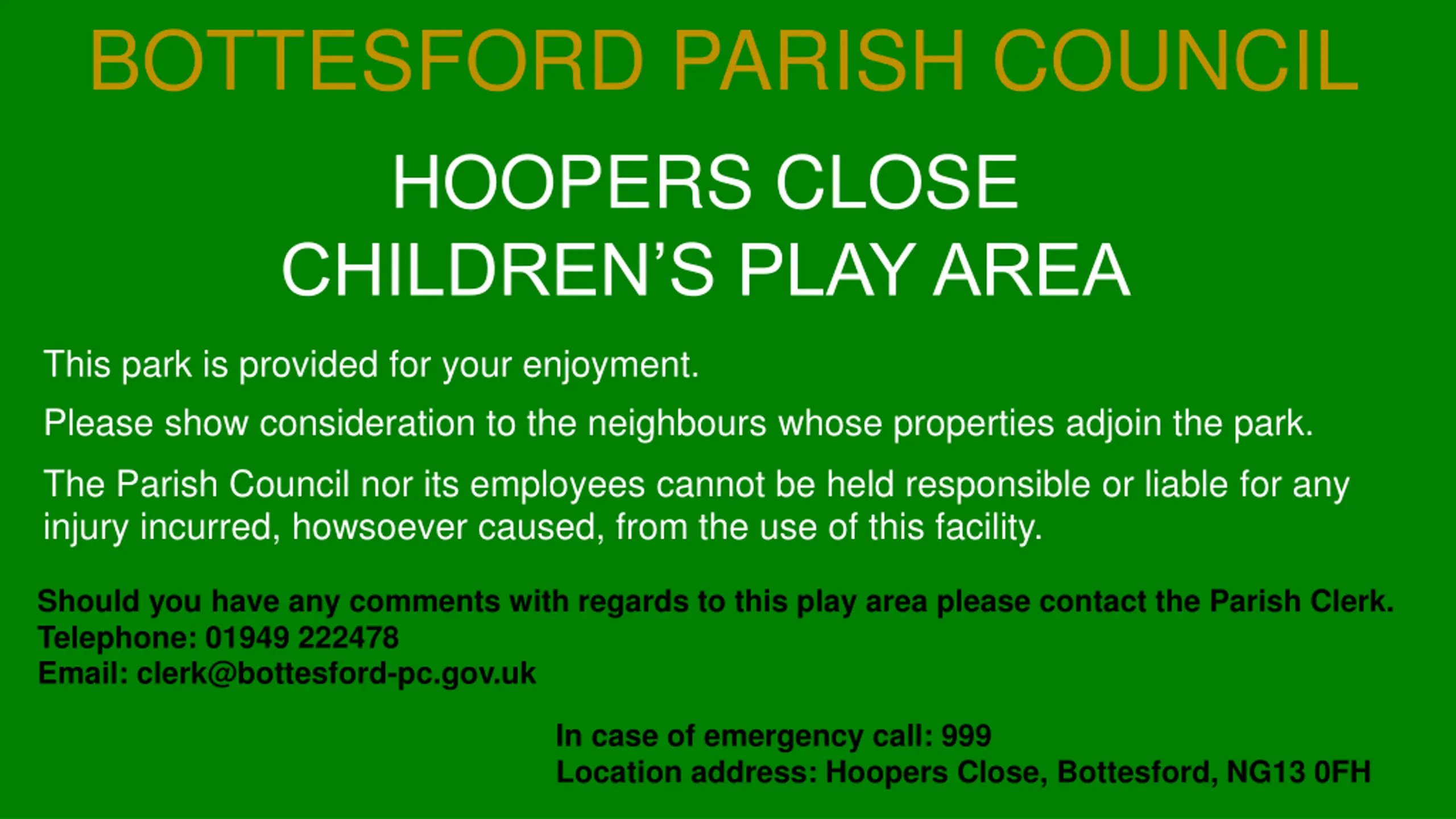 BOTTESFORD PARISH COUNCIL HOOPERS CLOSE CHILDREN S PLAY AREA This park is provided for your enjoyment. Please show consideration to the neighbours whose properties adjoin the park. The Parish Council nor its employees cannot be held responsible or liable for any injury incurred, howsoever caused, from the use of this facility. Should you have any comments with regards to this play area please contact the Parish Clerk. Telephone: 01949 222478 Email: clerk@bottesford-pc.gov.uk In case of emergency call: 999 Location address: Hoopers Close, Bottesford, NG13 0FH