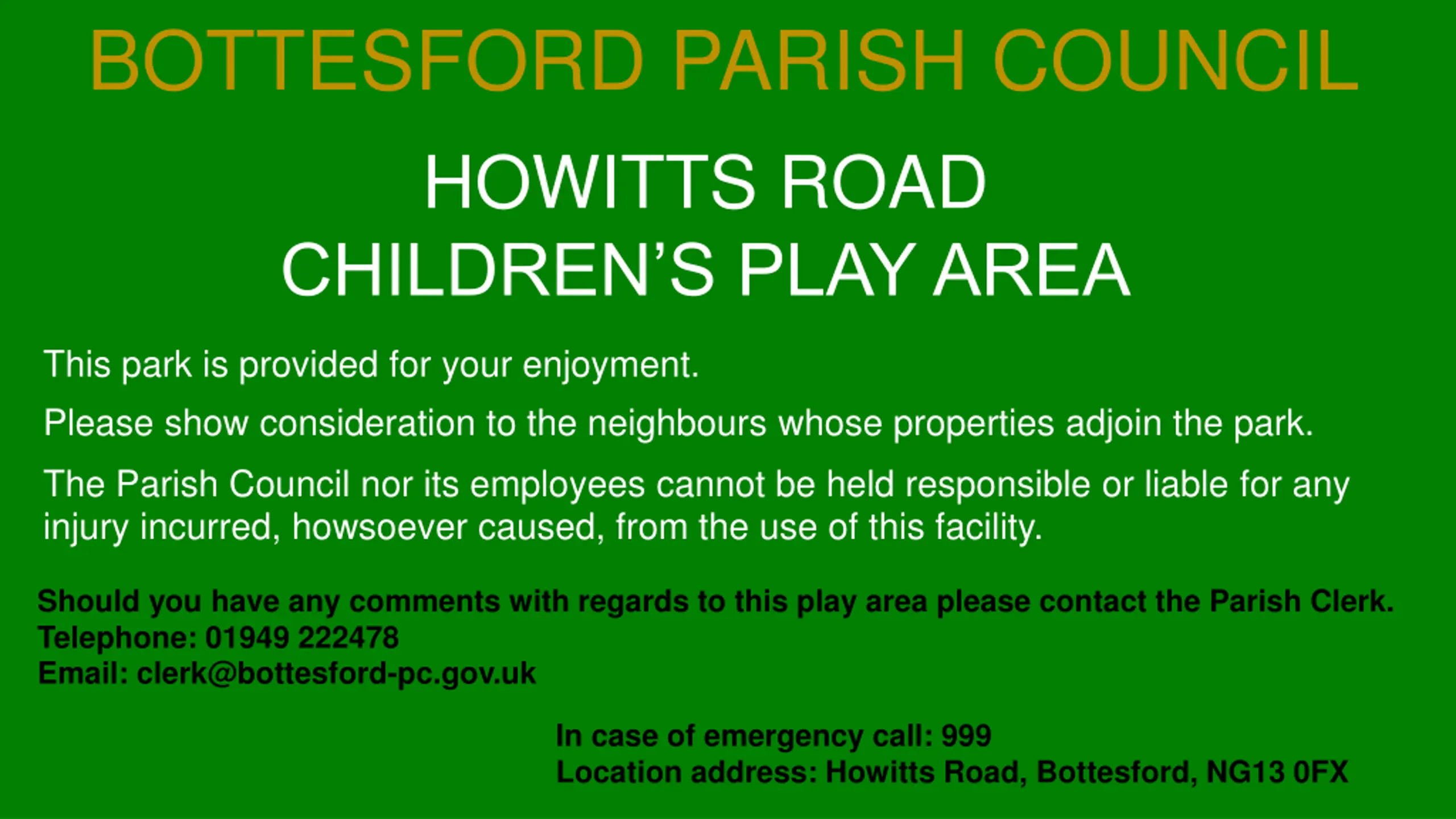 BOTTESFORD PARISH COUNCIL HOWITTS ROAD CHILDREN S PLAY AREA This park is provided for your enjoyment. Please show consideration to the neighbours whose properties adjoin the park. The Parish Council nor its employees cannot be held responsible or liable for any injury incurred, howsoever caused, from the use of this facility. Should you have any comments with regards to this play area please contact the Parish Clerk. Telephone: 01949 222478 Email: clerk@bottesford-pc.gov.uk In case of emergency call: 999 Location address: Howitts Road, Bottesford, NG13 0FX
