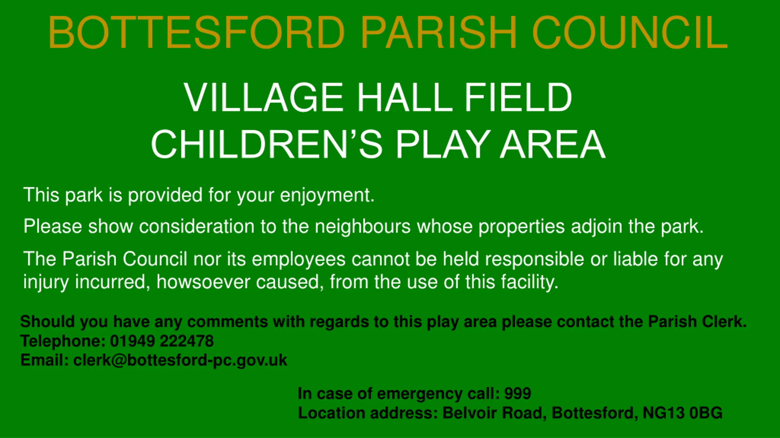 BOTTESFORD PARISH COUNCIL VILLAGE HALL FIELD CHILDREN S PLAY AREA This park is provided for your enjoyment. Please show consideration to the neighbours whose properties adjoin the park. The Parish Council nor its employees cannot be held responsible or liable for any injury incurred, howsoever caused, from the use of this facility. Should you have any comments with regards to this play area please contact the Parish Clerk. Telephone: 01949 222478 Email: clerk@bottesford-pc.gov.uk In case of emergency call: 999 Location address: Belvoir Road, Bottesford, NG13 0BG