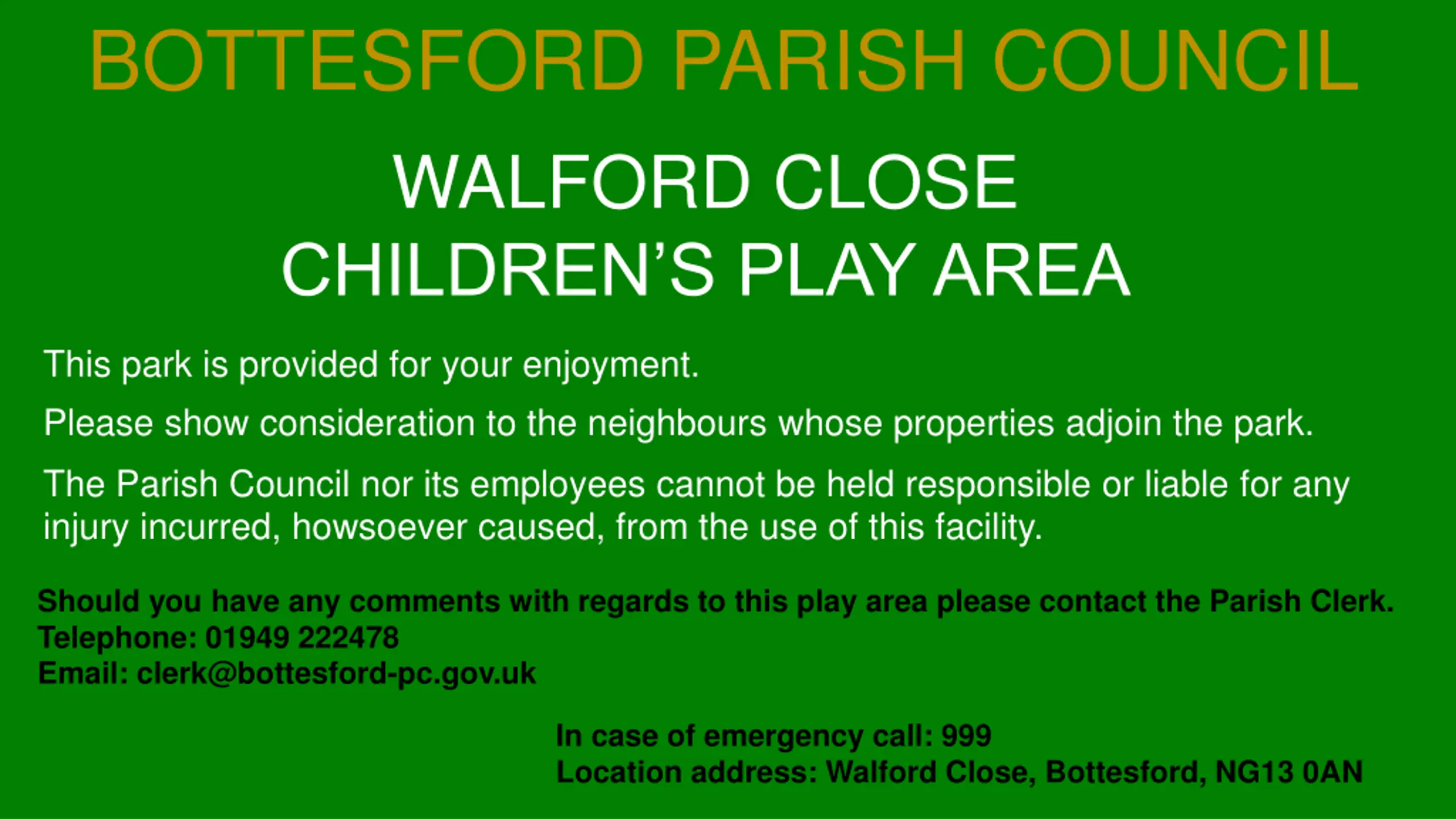 BOTTESFORD PARISH COUNCIL WALFORD CLOSE CHILDREN S PLAY AREA This park is provided for your enjoyment. Please show consideration to the neighbours whose properties adjoin the park. The Parish Council nor its employees cannot be held responsible or liable for any injury incurred, howsoever caused, from the use of this facility. Should you have any comments with regards to this play area please contact the Parish Clerk. Telephone: 01949 222478 Email: clerk@bottesford-pc.gov.uk In case of emergency call: 999 Location address: Walford Close, Bottesford, NG13 0AN