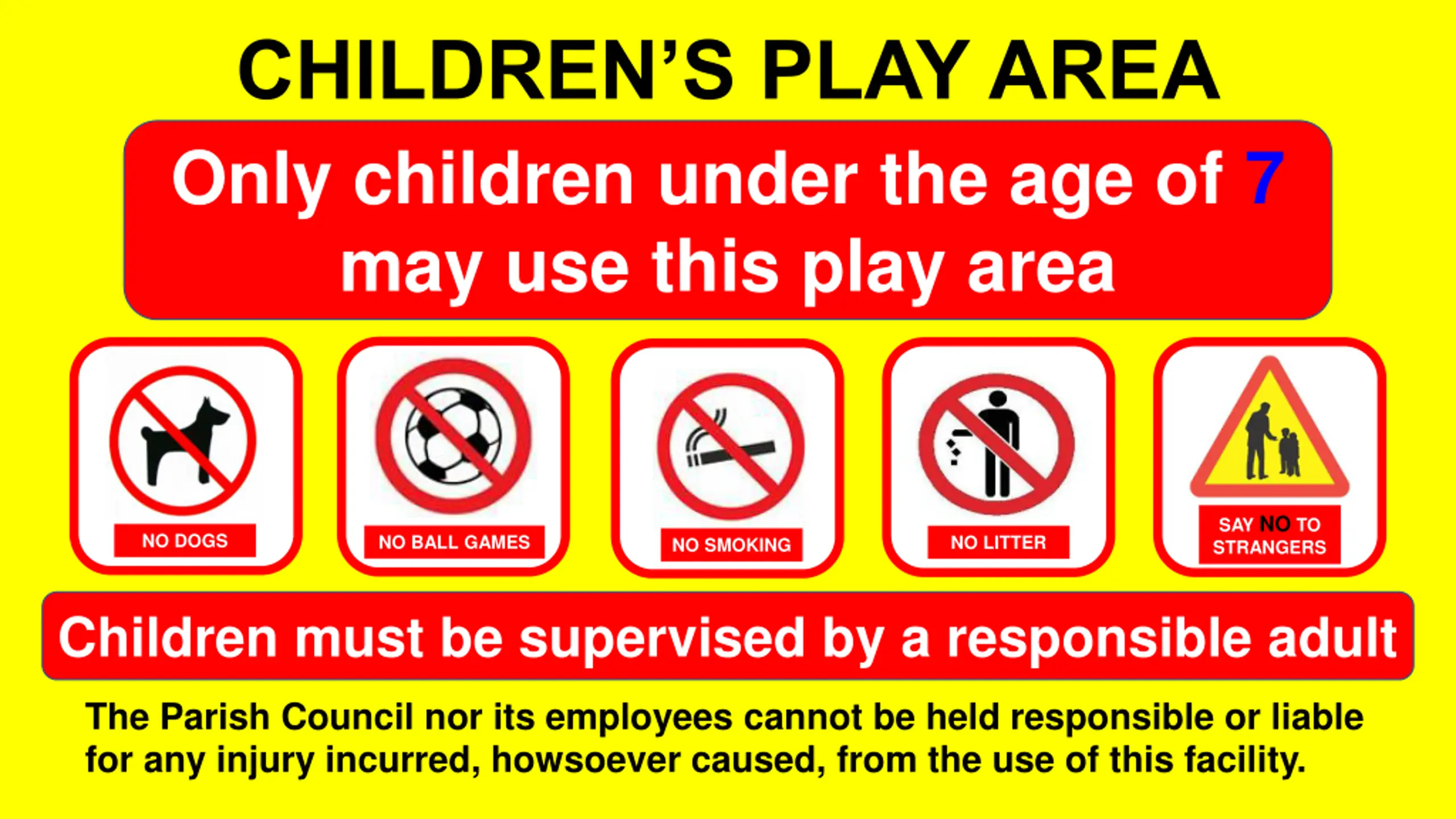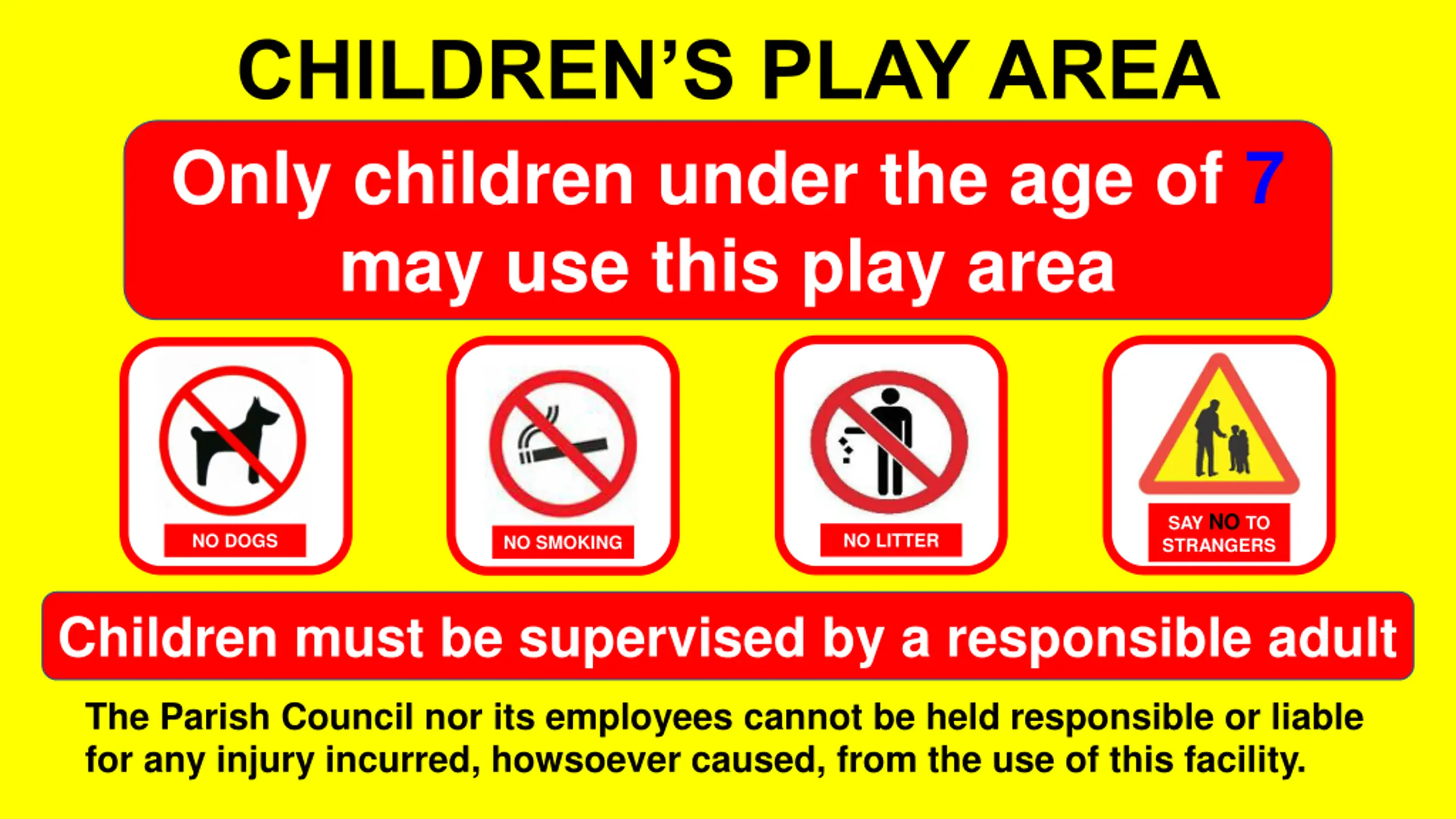 CHILDRENS PLAY AREA Only children under the age of 7 may use this play area SAY NO TO STRANGERS NO DOGS NO BALL GAMES NO LITTER NO SMOKING Children must be supervised by a responsible adult The Parish Council nor its employees cannot be held responsible or liable for any injury incurred, howsoever caused, from the use of this facility.